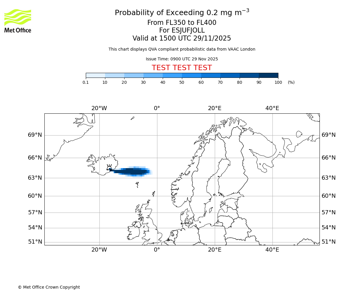 Modelled ash concentration from 000 to 200 for ESJUFJOLL. Valid at 0900 UTC 29/11/2025