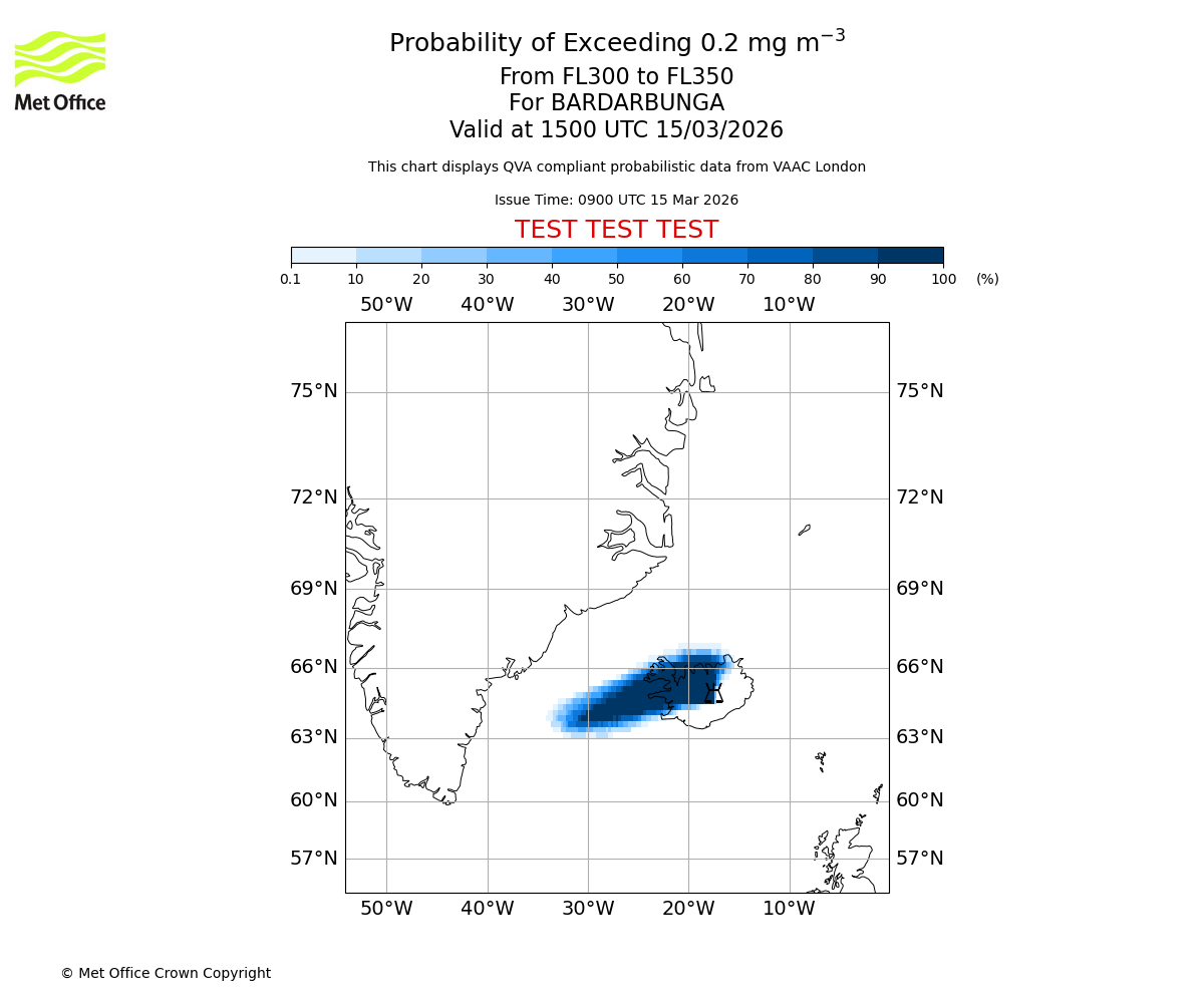 Probability of exceeding 0.2 milligrams per metre cubed. From 300 to 350 for BARDARBUNGA. Valid at 1200 UTC 15/03/2026