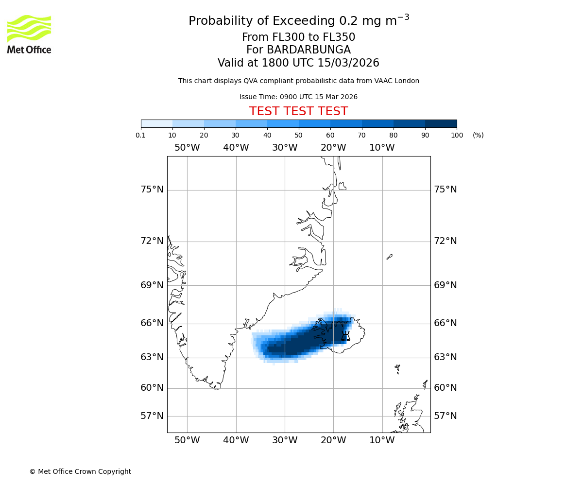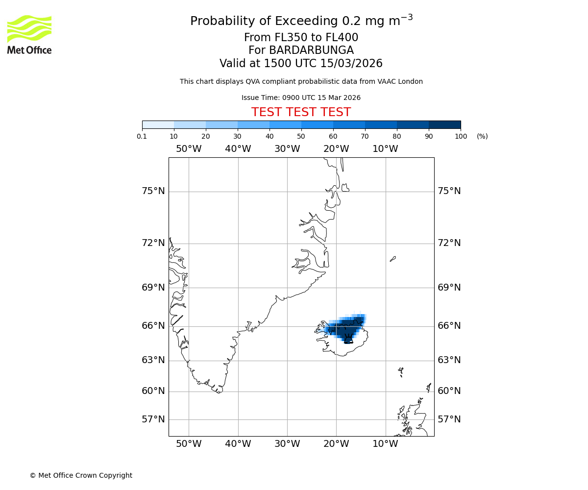 Probability of exceeding 0.2 milligrams per metre cubed. From 300 to 350 for BARDARBUNGA. Valid at 1500 UTC 15/03/2026