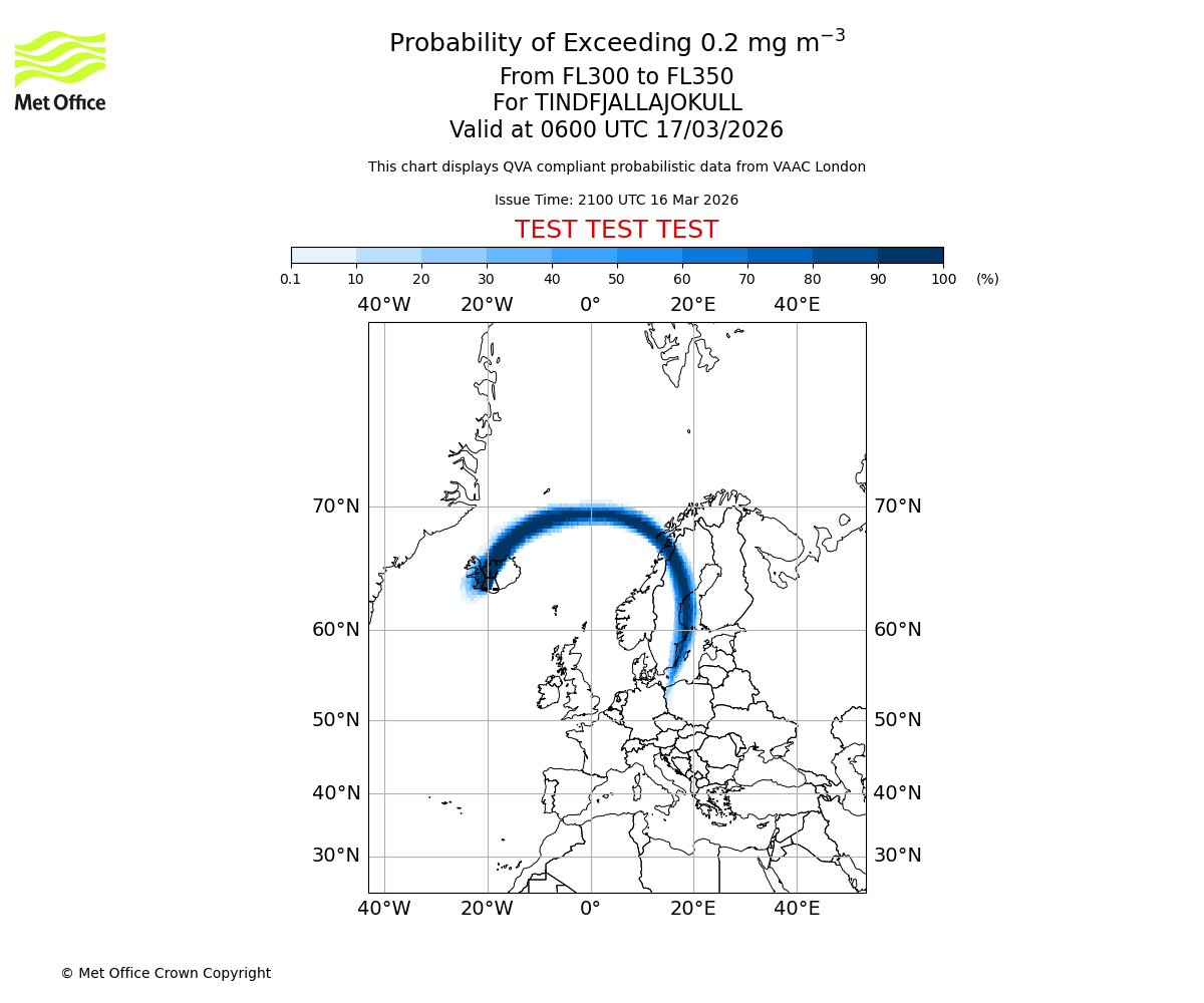 Probability of exceeding 0.2 milligrams per metre cubed. From 300 to 350 for TINDFJALLAJOKULL. Valid at 0300 UTC 17/03/2026