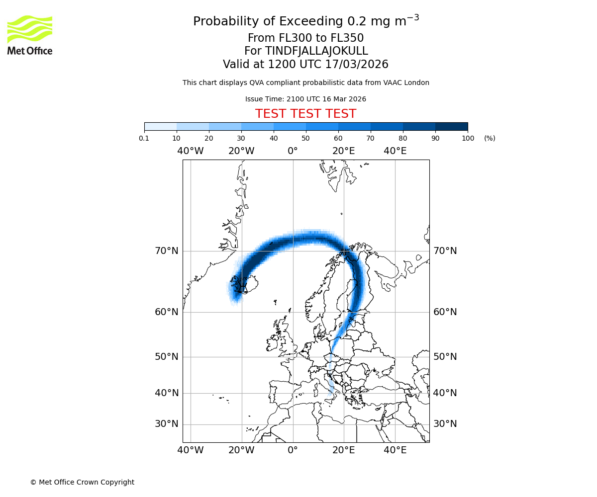 Probability of exceeding 0.2 milligrams per metre cubed. From 300 to 350 for TINDFJALLAJOKULL. Valid at 0900 UTC 17/03/2026