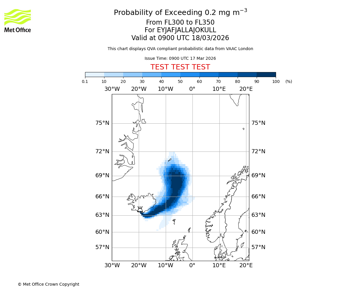 Probability of exceeding 0.2 milligrams per metre cubed. From 300 to 350 for EYJAFJALLAJOKULL. Valid at 0600 UTC 18/03/2026