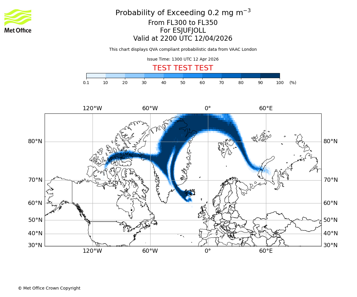 Quantitative Volcanic Ash charts (QVA) are produced in accordance with International Civil Aviation Organization (ICAO) Annex 3 requirements and are provided as well as the London Volcanic Ash Advisory Graphics (VAG) and Advisories (VAA). The lowest QVA threshold (0.2 mg/m³) matches to the areas depicted in the VAA and VAG. Both expected ash concentration and probabilistic forecast information is provided in the chart viewer below for eruptions occurring in the London Volcanic Ash Advisory Centre (VAAC) area of responsibility.