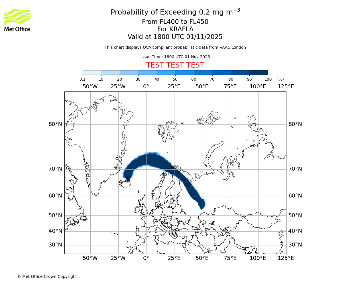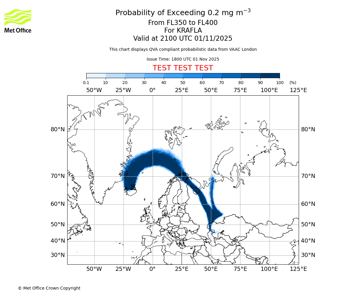 In accordance with ICAO Annex 3, Amendment 82 VAAC London will provide operational QVA forecasts from 27 November 2025 and these will be made available via a VAAC London QVA API information service. These charts are currently provided for test and evaluation purposes (not for operational use) until the introduction of the operational service.