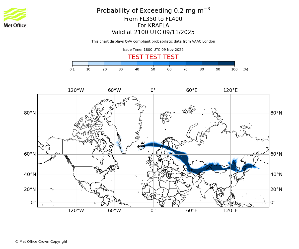 In accordance with ICAO Annex 3, Amendment 82 VAAC London will provide operational QVA forecasts from 27 November 2025 and these will be made available via a VAAC London QVA API information service. These charts are currently provided for test and evaluation purposes (not for operational use) until the introduction of the operational service.