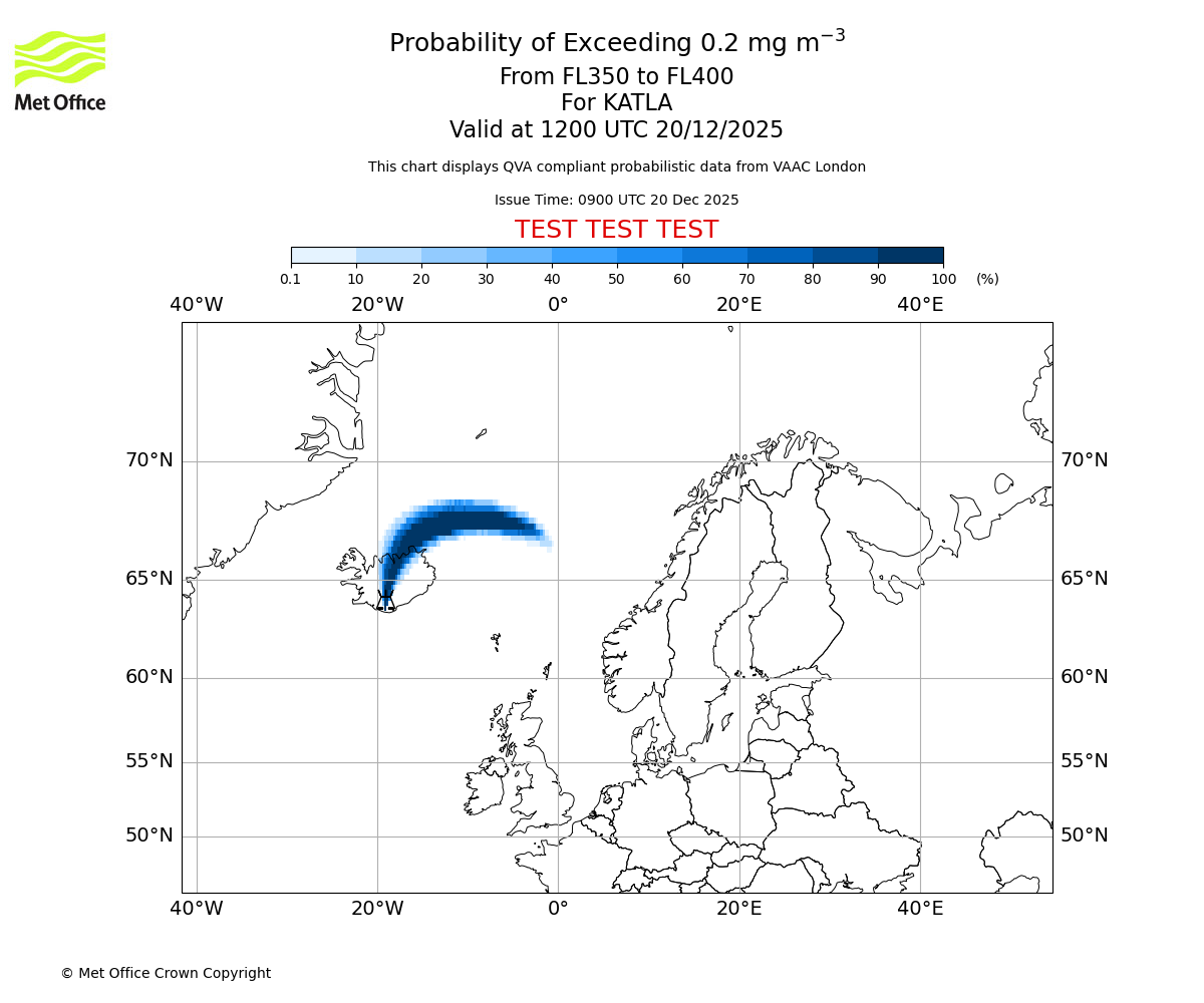 Probability of exceeding 0.2 milligrams per metre cubed. From 350 to 400 for KATLA. Valid at 0900 UTC 20/12/2025