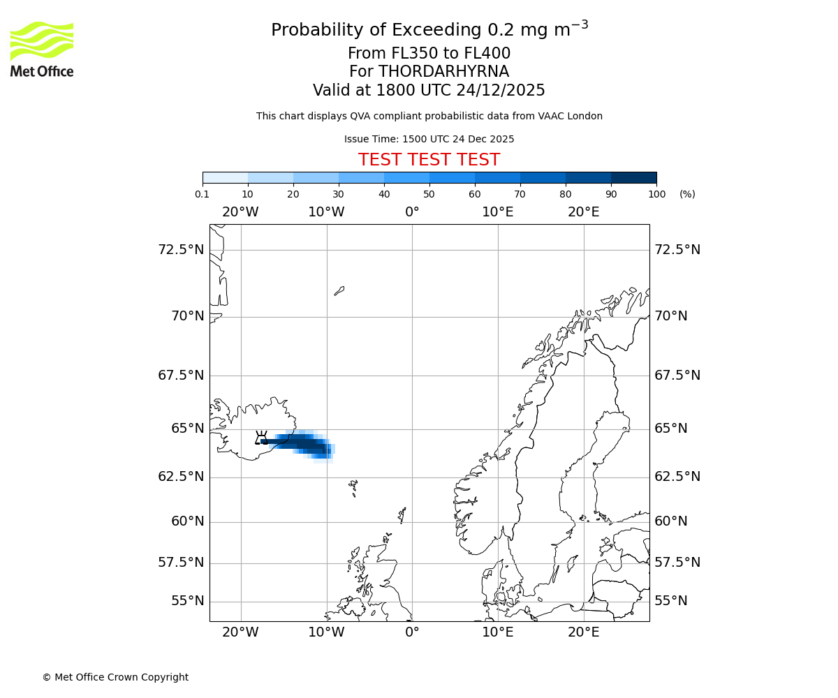 Quantitative Volcanic Ash charts (QVA) are produced in accordance with International Civil Aviation Organization (ICAO) Annex 3 requirements and are provided as well as the London Volcanic Ash Advisory Graphics (VAG) and Advisories (VAA). The lowest QVA threshold (0.2 mg/m³) matches to the areas depicted in the VAA and VAG. Both expected ash concentration and probabilistic forecast information is provided in the chart viewer below for eruptions occurring in the London Volcanic Ash Advisory Centre (VAAC) area of responsibility.