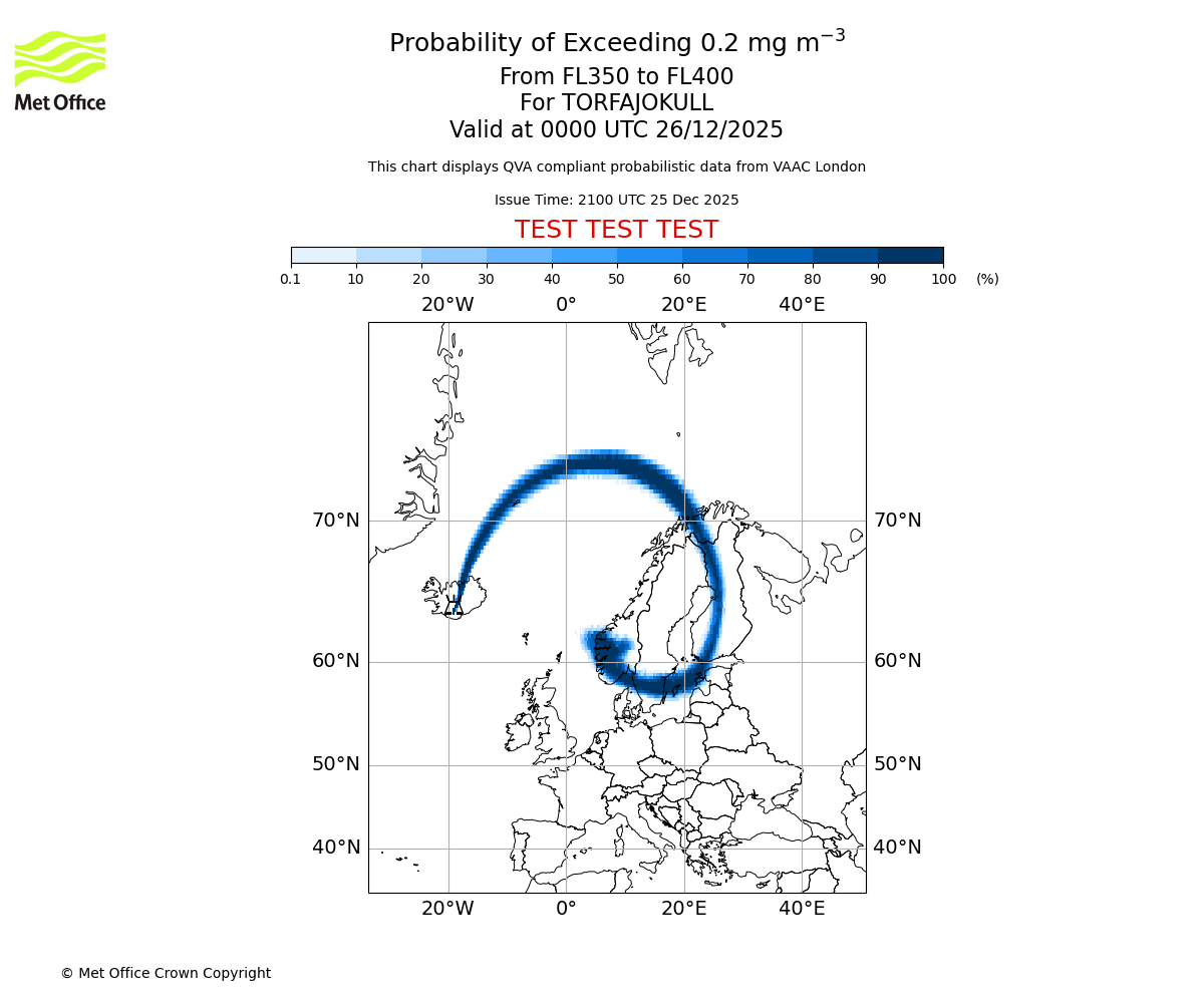 Probability of exceeding 0.2 milligrams per metre cubed. From 350 to 400 for TORFAJOKULL. Valid at 2100 UTC 25/12/2025