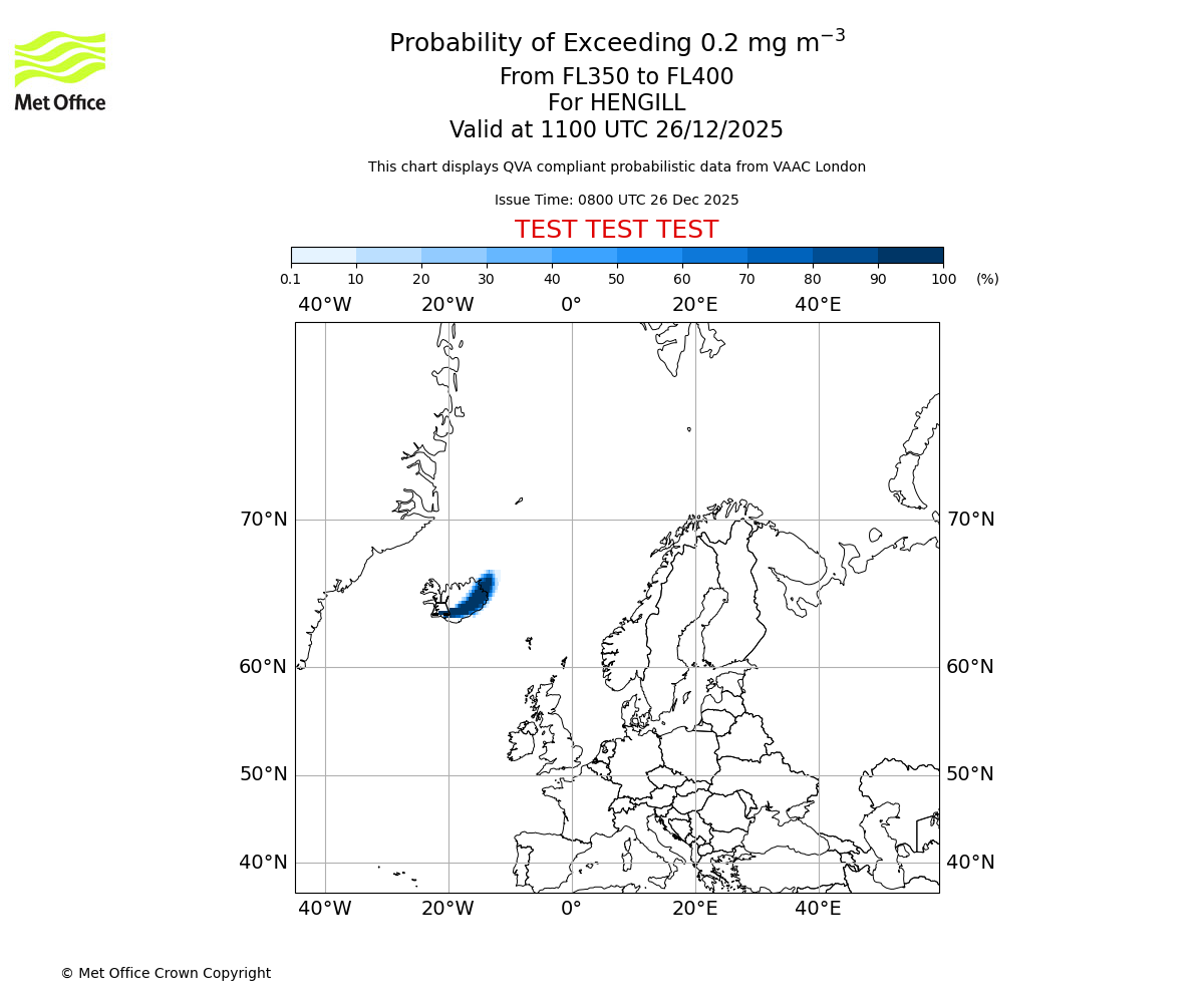 Probability of exceeding 0.2 milligrams per metre cubed. From 350 to 400 for HENGILL. Valid at 0800 UTC 26/12/2025