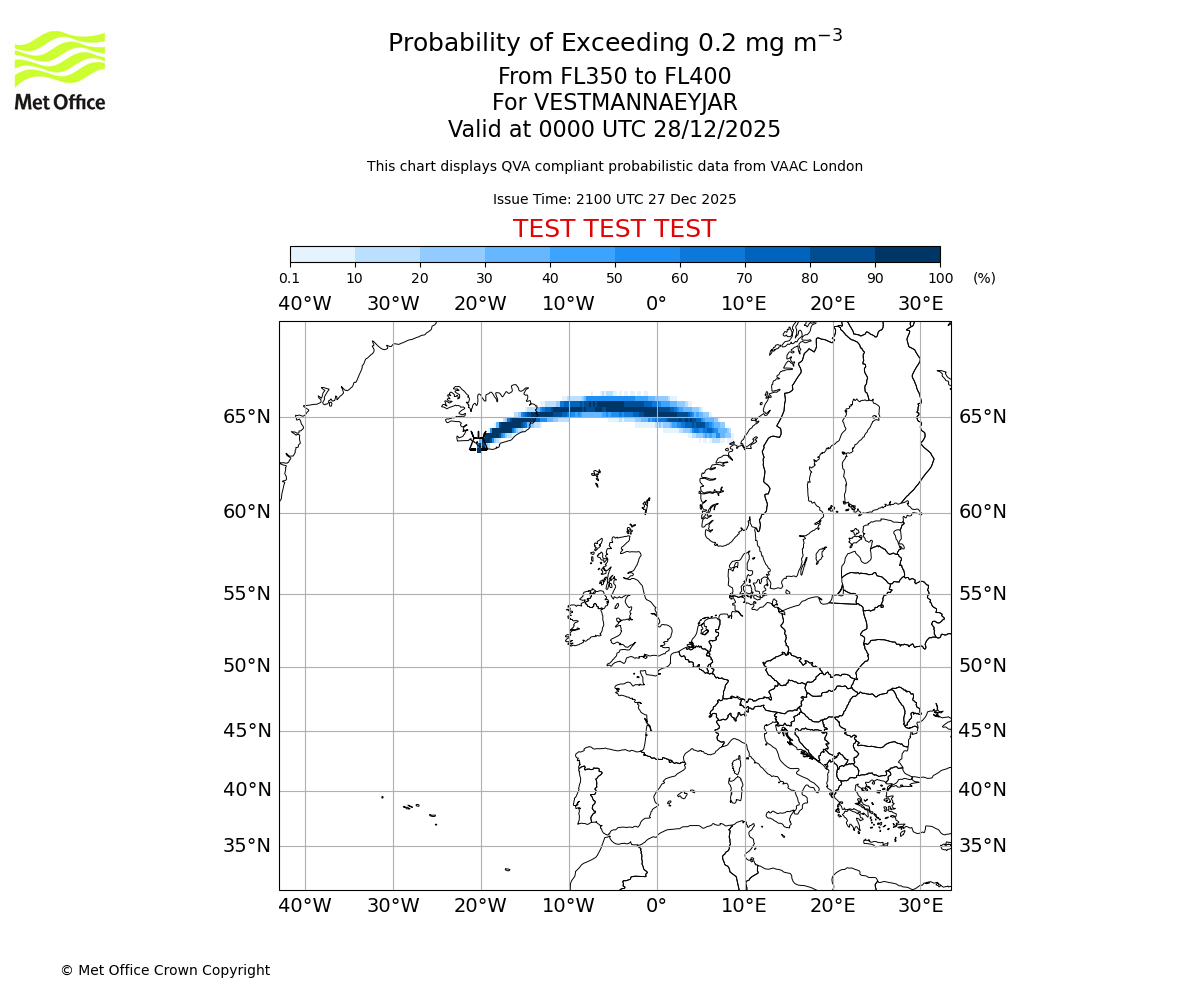 Probability of exceeding 0.2 milligrams per metre cubed. From 350 to 400 for VESTMANNAEYJAR. Valid at 2100 UTC 27/12/2025