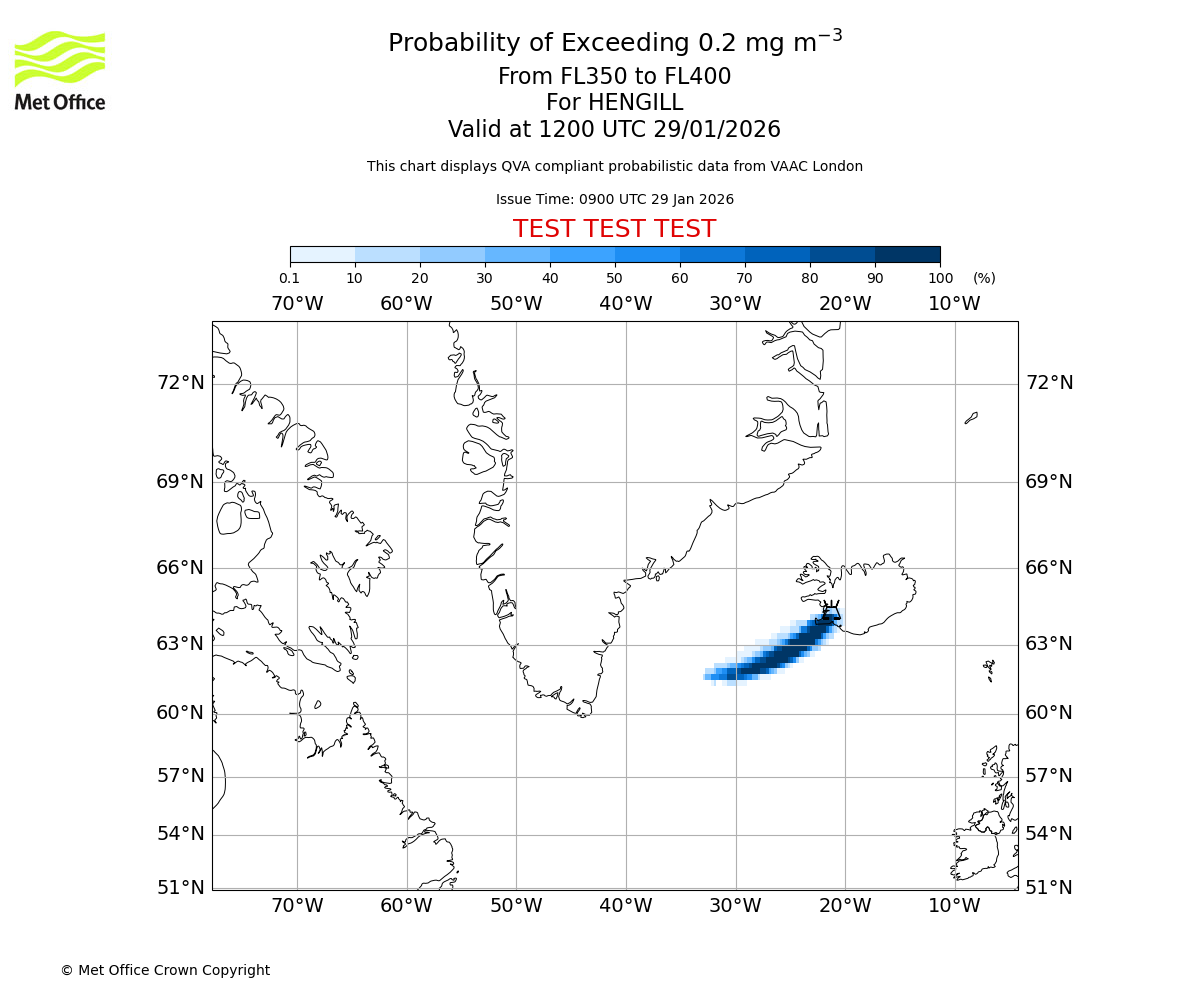 Modelled ash concentration from 000 to 200 for HENGILL. Valid at 0900 UTC 29/01/2026