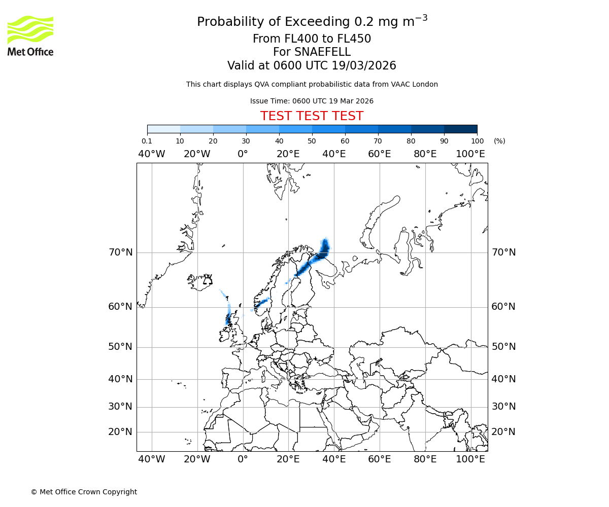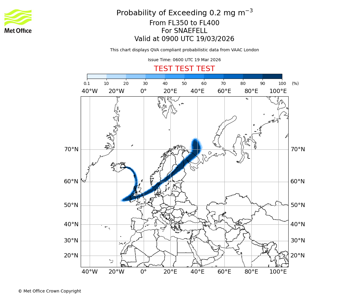 Quantitative Volcanic Ash charts (QVA) are produced in accordance with International Civil Aviation Organization (ICAO) Annex 3 requirements and are provided as well as the London Volcanic Ash Advisory Graphics (VAG) and Advisories (VAA). The lowest QVA threshold (0.2 mg/m³) matches to the areas depicted in the VAA and VAG. Both expected ash concentration and probabilistic forecast information is provided in the chart viewer below for eruptions occurring in the London Volcanic Ash Advisory Centre (VAAC) area of responsibility.