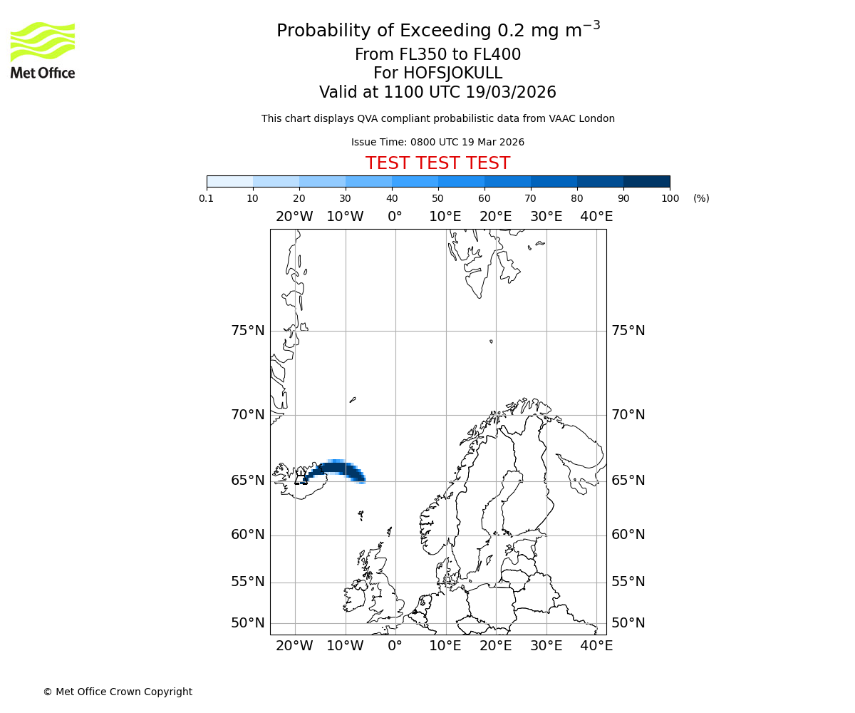 Probability of exceeding 0.2 milligrams per metre cubed. From 350 to 400 for HOFSJOKULL. Valid at 0800 UTC 19/03/2026
