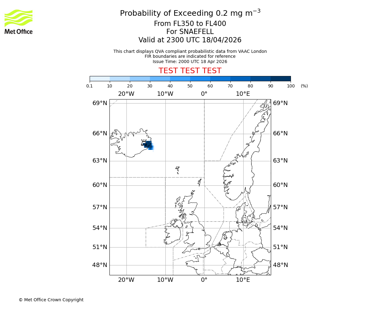 Probability of exceeding 0.2 milligrams per metre cubed. From 350 to 400 for SNAEFELL. Valid at 2000 UTC 18/04/2026