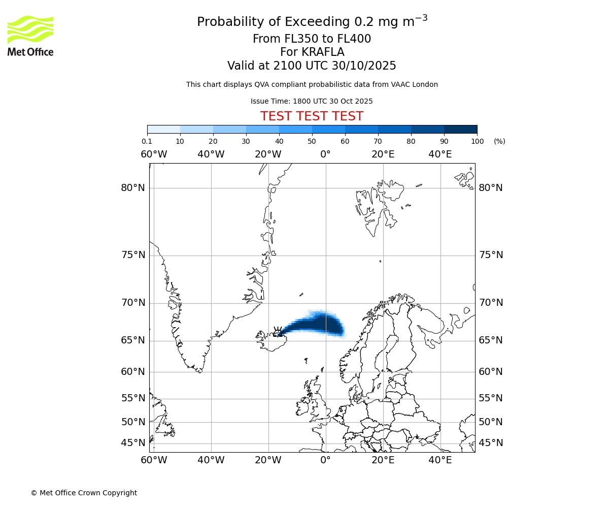 Probability of exceeding 0.2 milligrams per metre cubed. From 350 to 400 for KRAFLA. Valid at 1800 UTC 30/10/2025