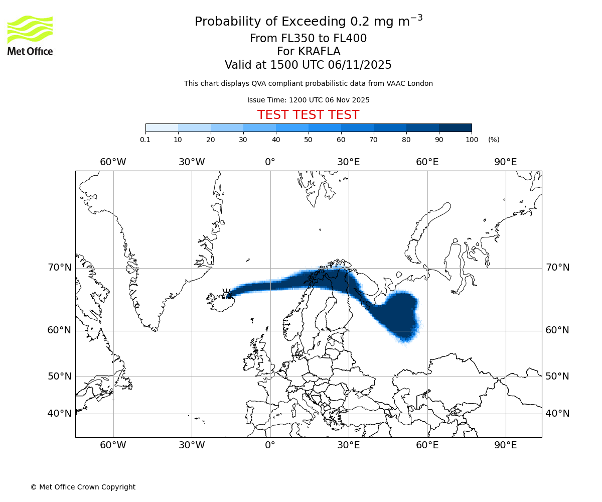 In accordance with ICAO Annex 3, Amendment 82 VAAC London will provide operational QVA forecasts from 27 November 2025 and these will be made available via a VAAC London QVA API information service. These charts are currently provided for test and evaluation purposes (not for operational use) until the introduction of the operational service.