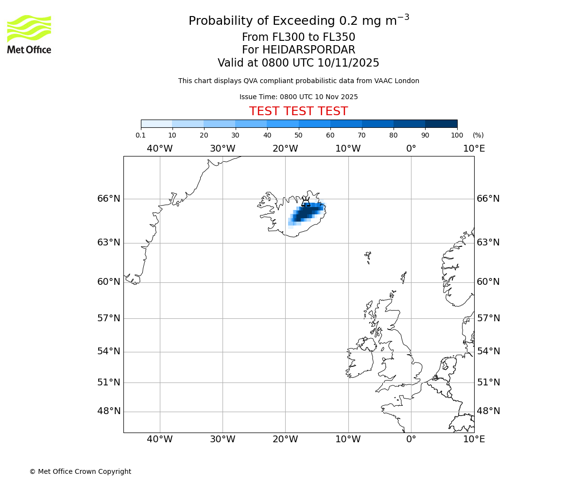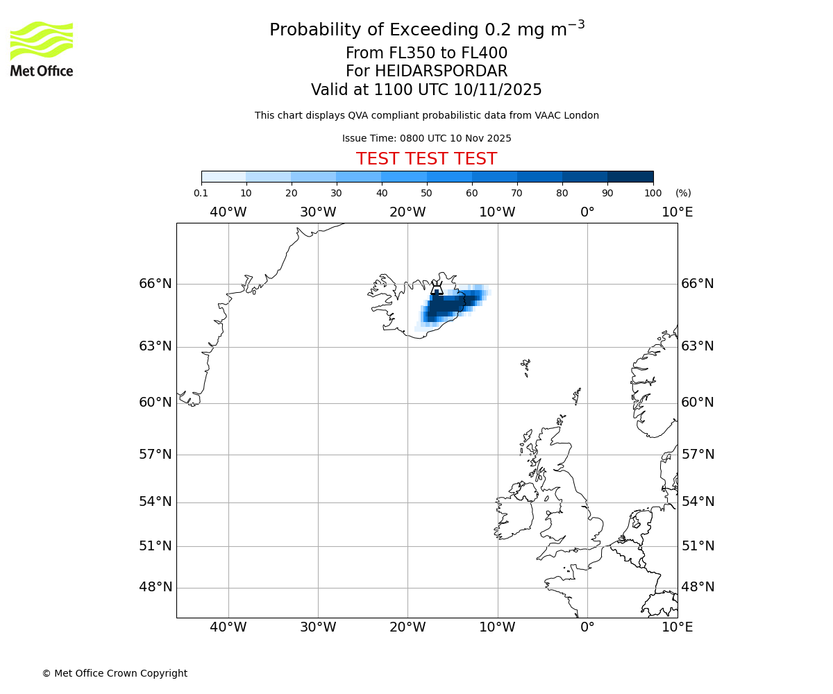 Probability of exceeding 0.2 milligrams per metre cubed. From 350 to 400 for HEIDARSPORDAR. Valid at 0800 UTC 10/11/2025