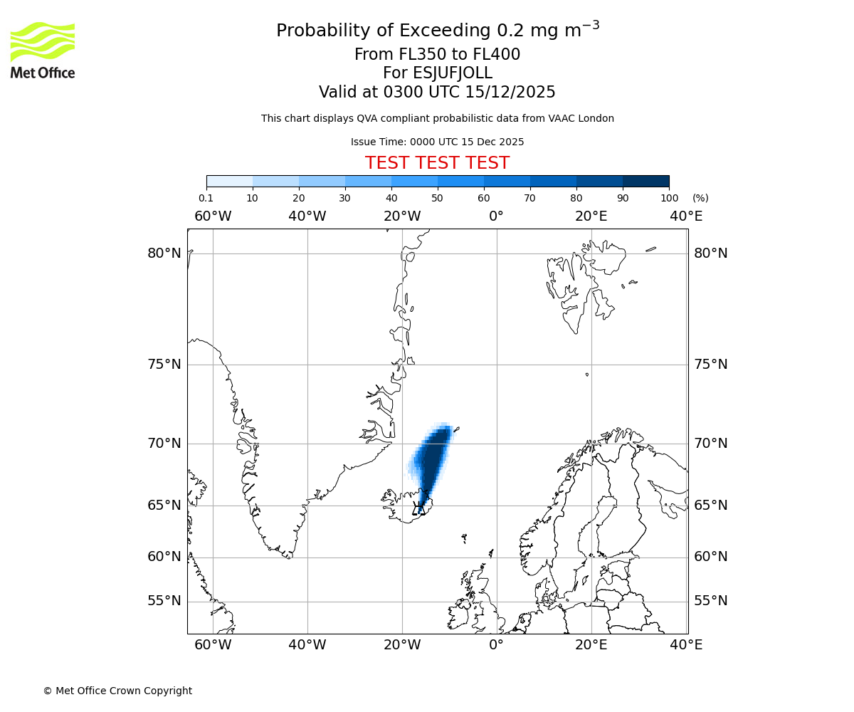 Quantitative Volcanic Ash charts (QVA) are produced in accordance with International Civil Aviation Organization (ICAO) Annex 3 requirements and are provided as well as the London Volcanic Ash Advisory Graphics (VAG) and Advisories (VAA). The lowest QVA threshold (0.2 mg/m³) matches to the areas depicted in the VAA and VAG. Both expected ash concentration and probabilistic forecast information is provided in the chart viewer below for eruptions occurring in the London Volcanic Ash Advisory Centre (VAAC) area of responsibility.