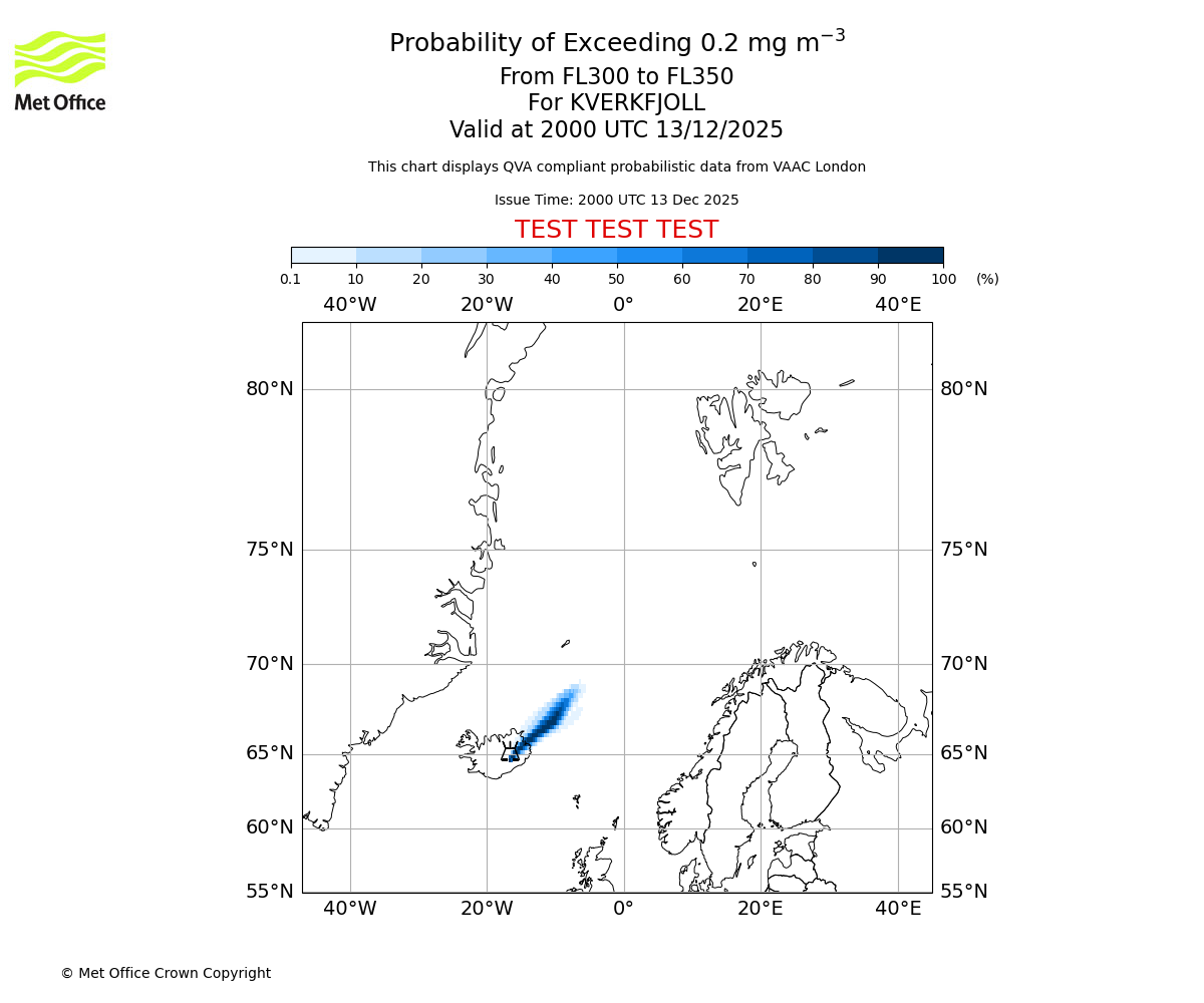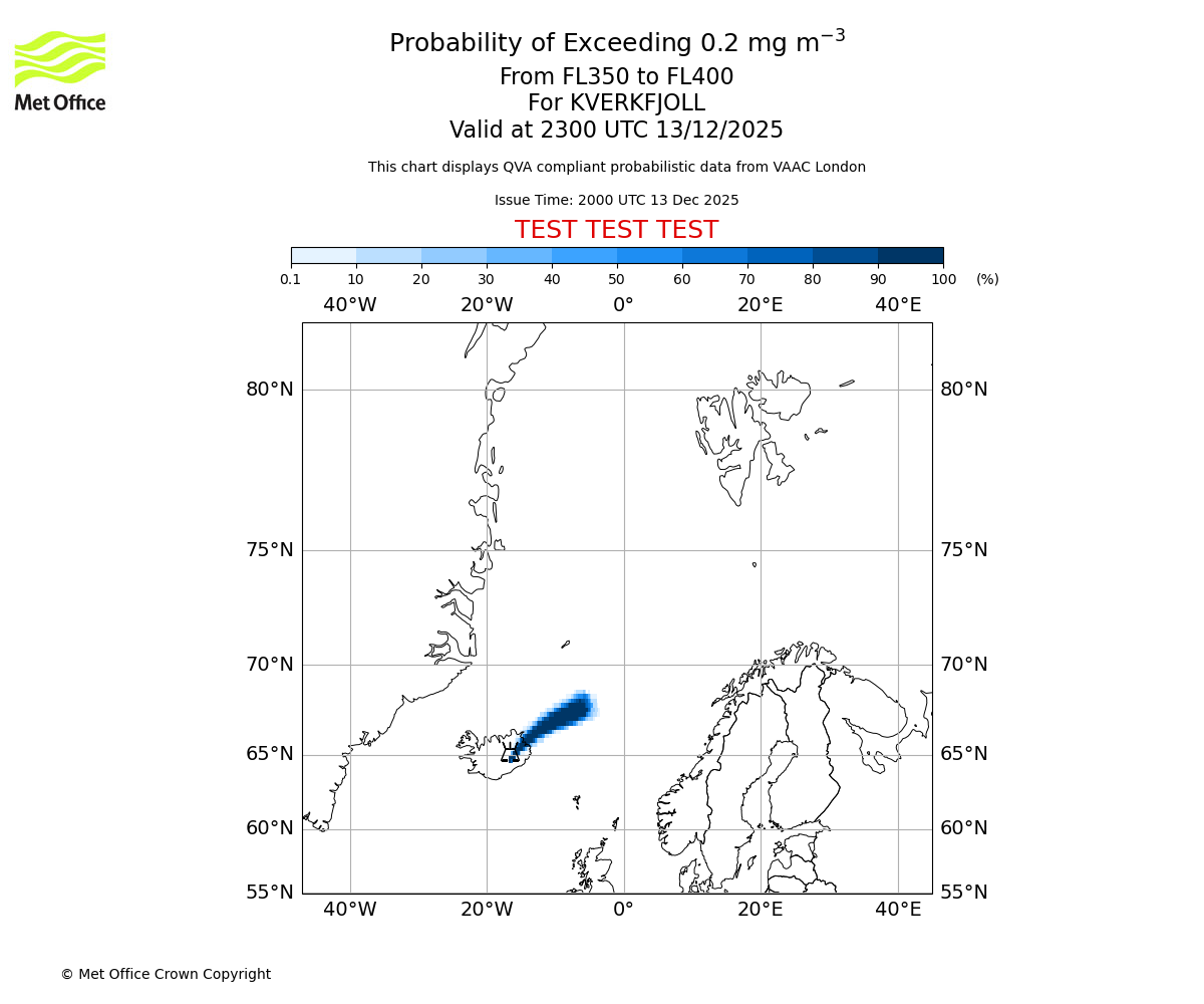 Quantitative Volcanic Ash charts (QVA) are produced in accordance with International Civil Aviation Organization (ICAO) Annex 3 requirements and are provided as well as the London Volcanic Ash Advisory Graphics (VAG) and Advisories (VAA). The lowest QVA threshold (0.2 mg/m³) matches to the areas depicted in the VAA and VAG. Both expected ash concentration and probabilistic forecast information is provided in the chart viewer below for eruptions occurring in the London Volcanic Ash Advisory Centre (VAAC) area of responsibility.