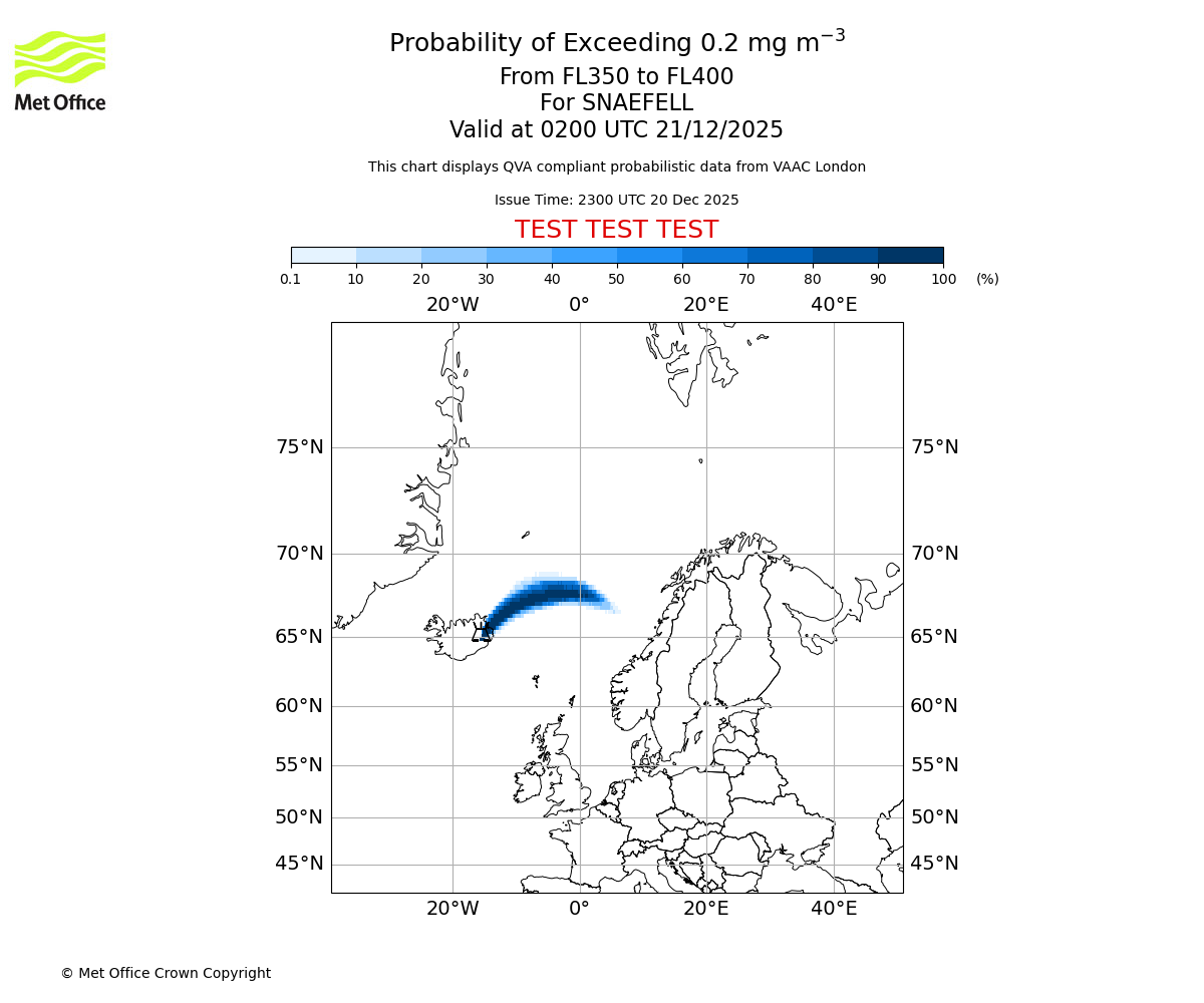 Quantitative Volcanic Ash charts (QVA) are produced in accordance with International Civil Aviation Organization (ICAO) Annex 3 requirements and are provided as well as the London Volcanic Ash Advisory Graphics (VAG) and Advisories (VAA). The lowest QVA threshold (0.2 mg/m³) matches to the areas depicted in the VAA and VAG. Both expected ash concentration and probabilistic forecast information is provided in the chart viewer below for eruptions occurring in the London Volcanic Ash Advisory Centre (VAAC) area of responsibility.