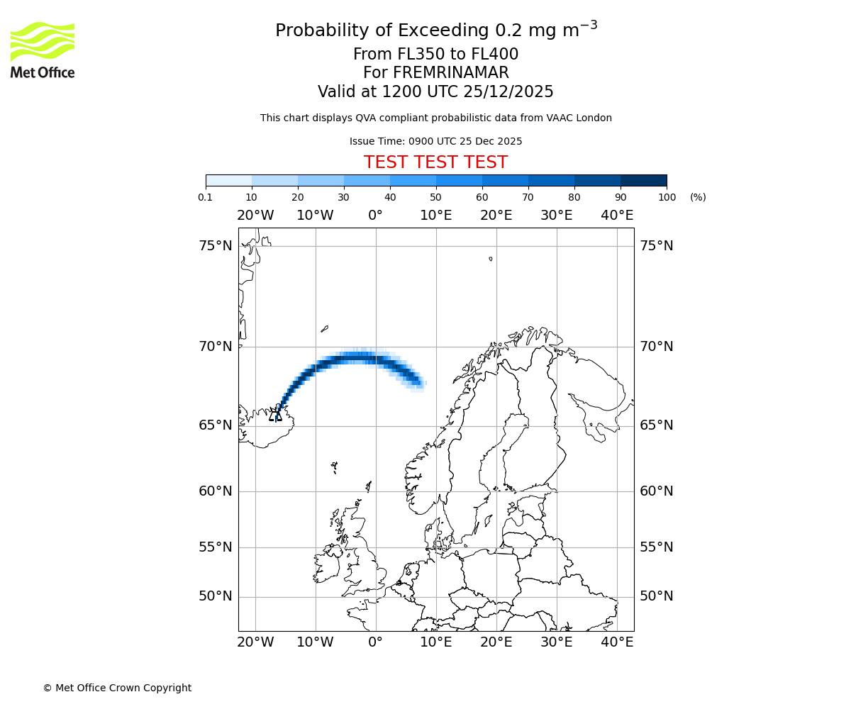 Modelled ash concentration from 000 to 200 for FREMRINAMAR. Valid at 0900 UTC 25/12/2025