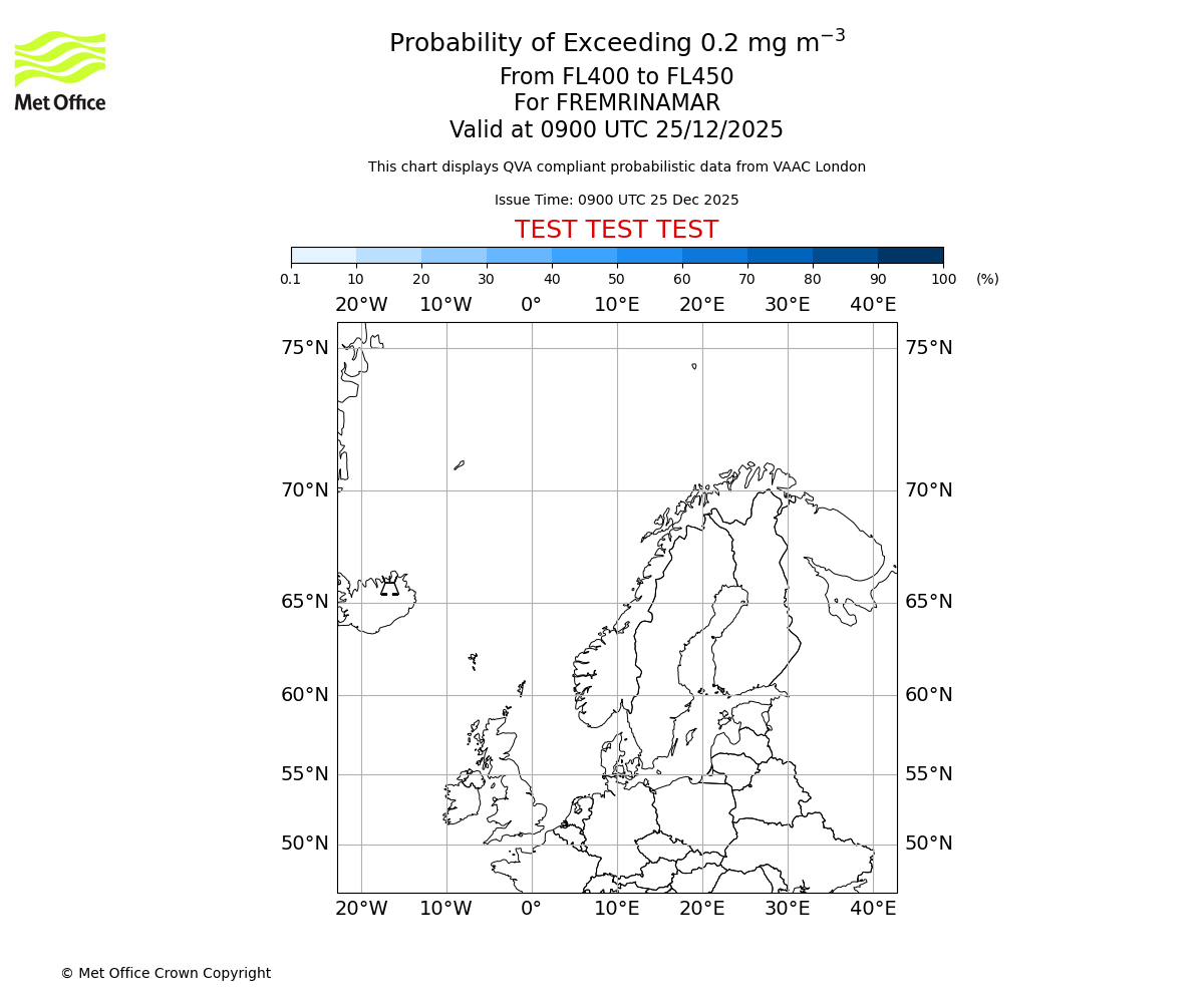 Probability of exceeding 0.2 milligrams per metre cubed. From 350 to 400 for FREMRINAMAR. Valid at 0900 UTC 25/12/2025