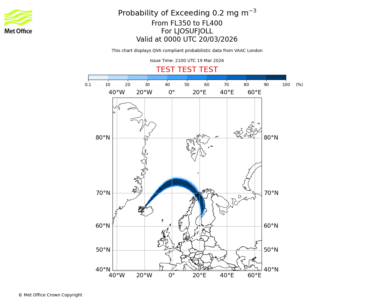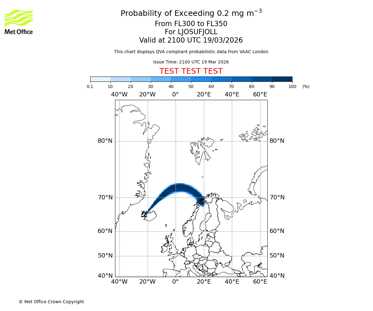 Quantitative Volcanic Ash charts (QVA) are produced in accordance with International Civil Aviation Organization (ICAO) Annex 3 requirements and are provided as well as the London Volcanic Ash Advisory Graphics (VAG) and Advisories (VAA). The lowest QVA threshold (0.2 mg/m³) matches to the areas depicted in the VAA and VAG. Both expected ash concentration and probabilistic forecast information is provided in the chart viewer below for eruptions occurring in the London Volcanic Ash Advisory Centre (VAAC) area of responsibility.