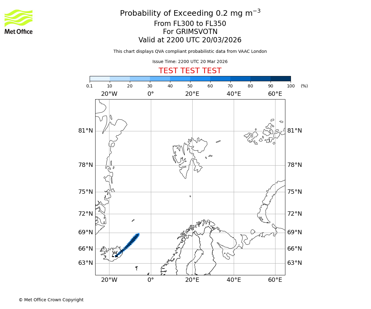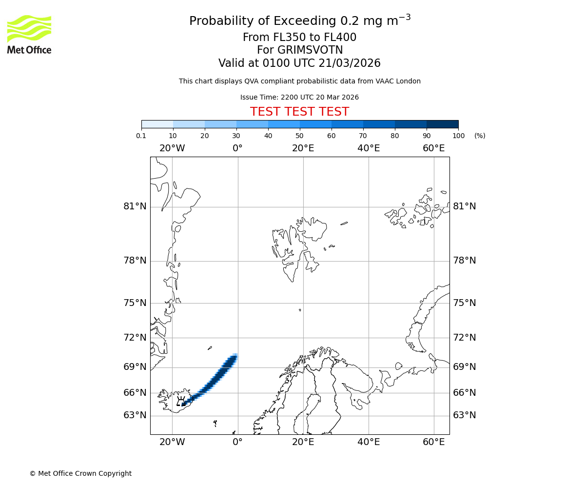 Probability of exceeding 0.2 milligrams per metre cubed. From 350 to 400 for GRIMSVOTN. Valid at 2200 UTC 20/03/2026