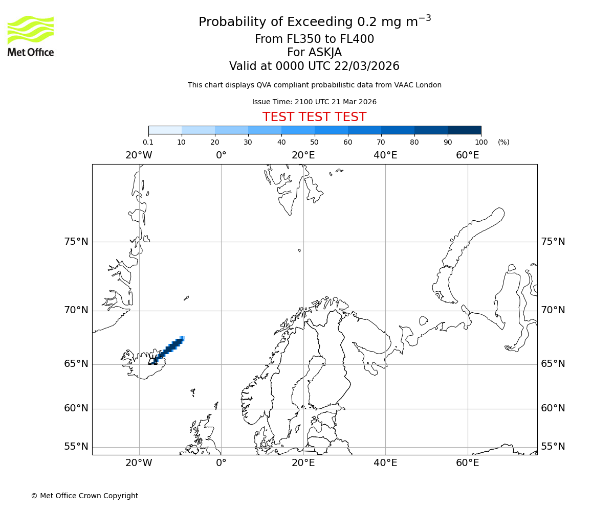 Probability of exceeding 0.2 milligrams per metre cubed. From 350 to 400 for ASKJA. Valid at 2100 UTC 21/03/2026