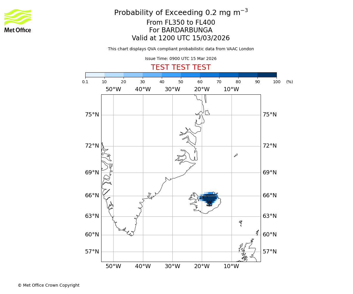 Probability of exceeding 0.2 milligrams per metre cubed. From 350 to 400 for BARDARBUNGA. Valid at 0900 UTC 15/03/2026