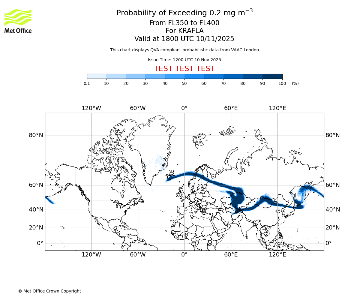 In accordance with ICAO Annex 3, Amendment 82 VAAC London will provide operational QVA forecasts from 27 November 2025 and these will be made available via a VAAC London QVA API information service. These charts are currently provided for test and evaluation purposes (not for operational use) until the introduction of the operational service.