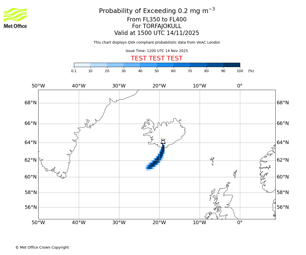Probability of exceeding 0.2 milligrams per metre cubed. From 350 to 400 for TORFAJOKULL. Valid at 1200 UTC 14/11/2025