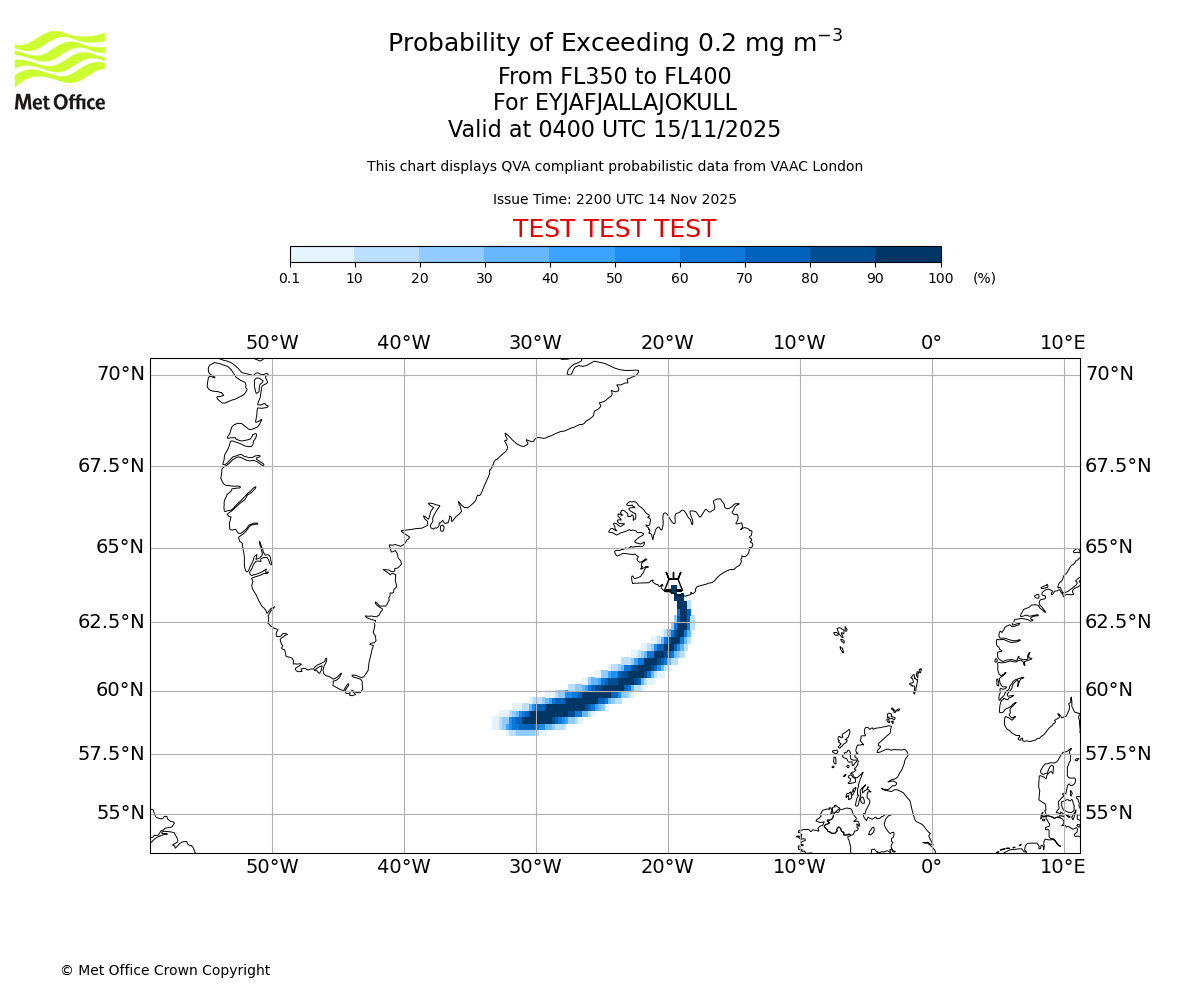 In accordance with ICAO Annex 3, Amendment 82 VAAC London will provide operational QVA forecasts from 27 November 2025 and these will be made available via a VAAC London QVA API information service. These charts are currently provided for test and evaluation purposes (not for operational use) until the introduction of the operational service.