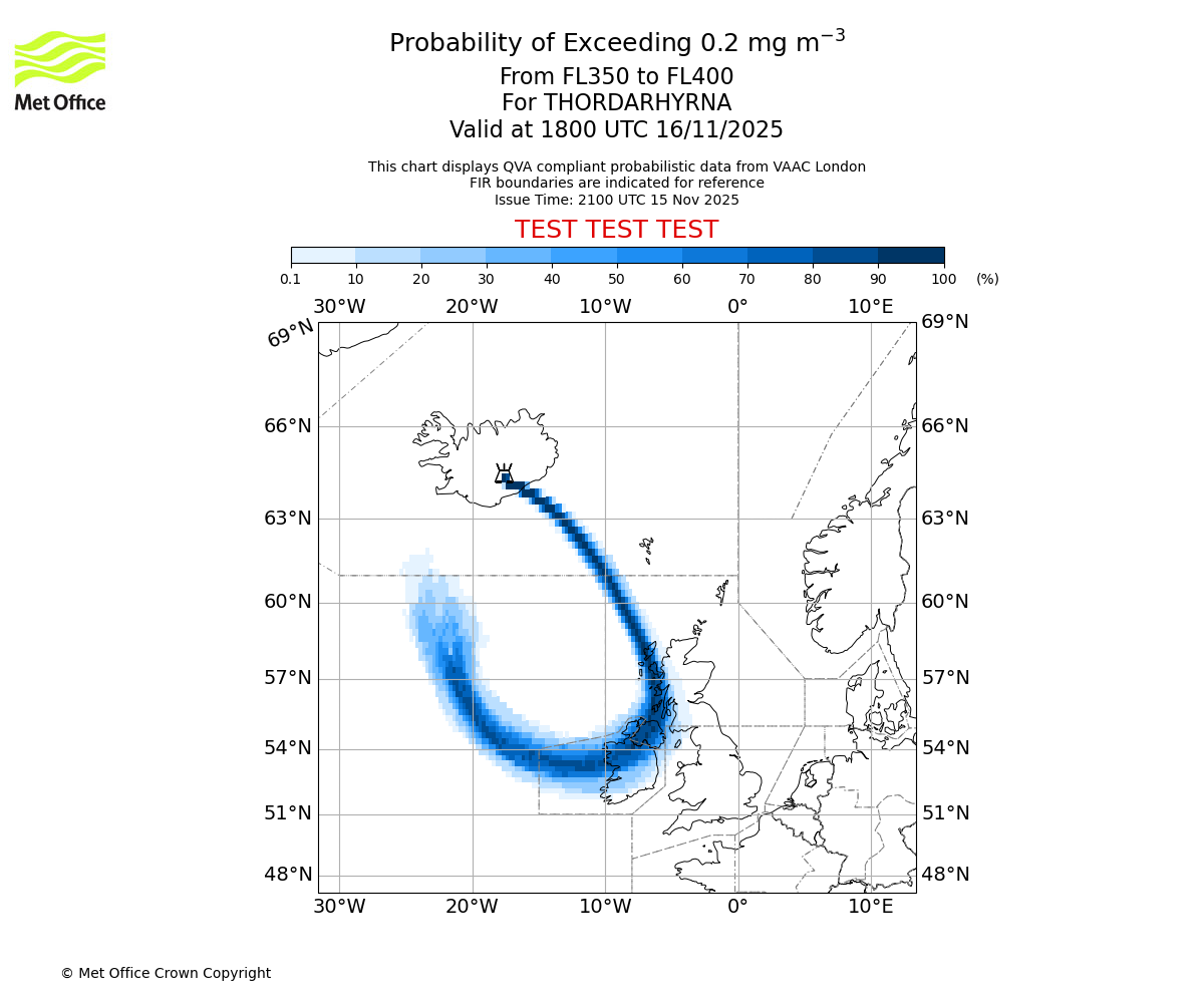 Probability of exceeding 0.2 milligrams per metre cubed. From 350 to 400 for THORDARHYRNA. Valid at 1500 UTC 16/11/2025