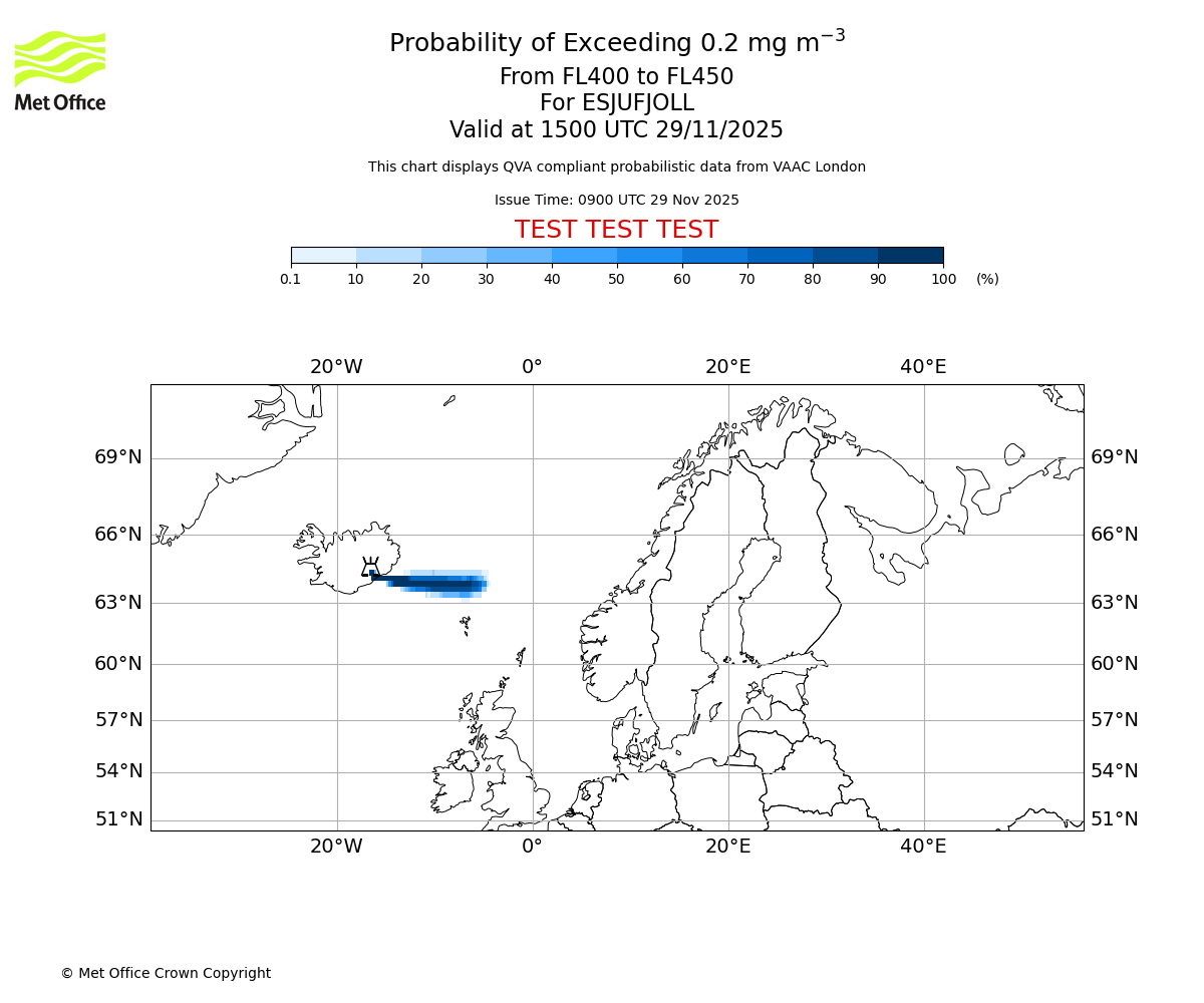 Modelled ash concentration from 000 to 200 for ESJUFJOLL. Valid at 0900 UTC 29/11/2025