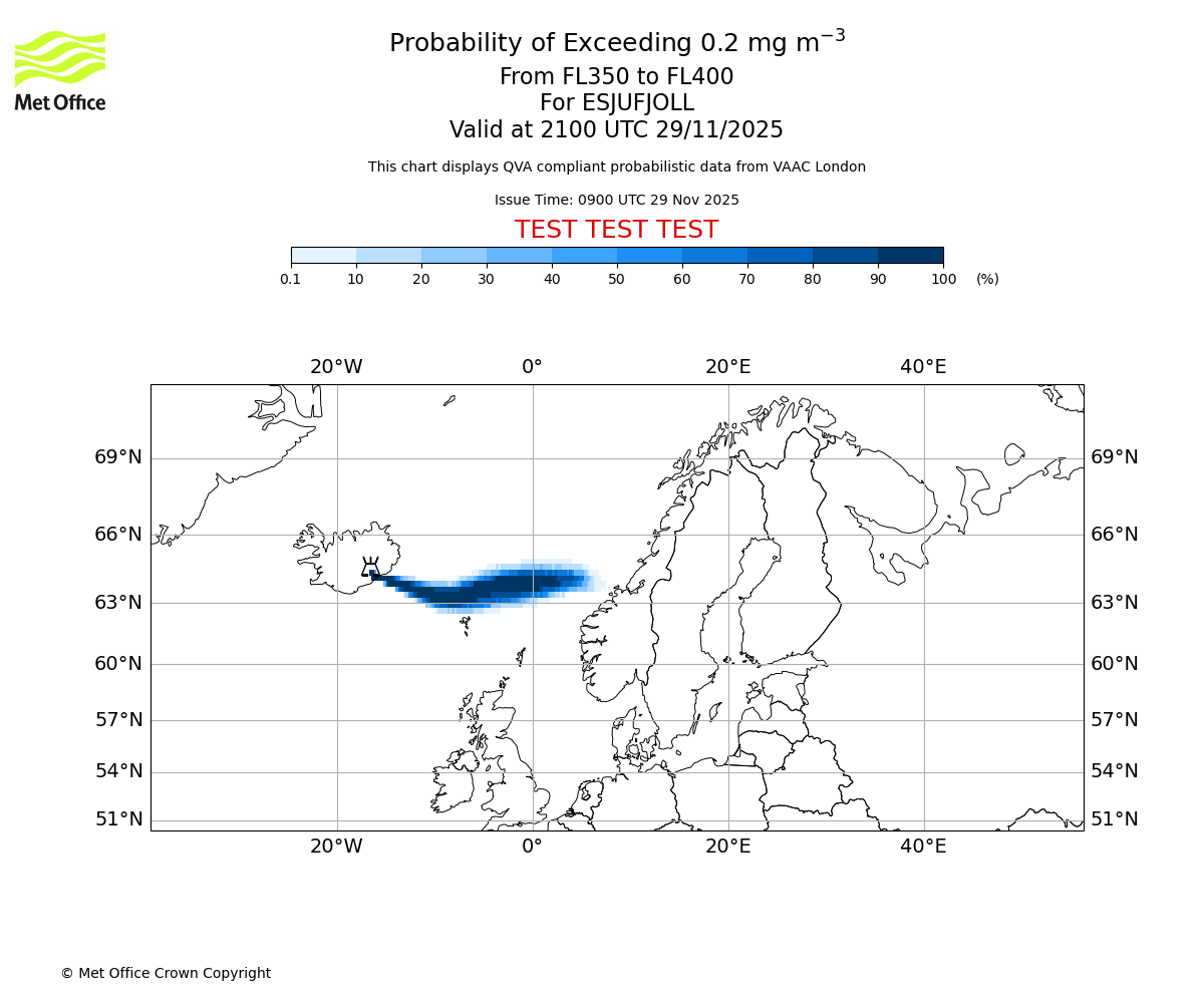 Quantitative Volcanic Ash charts (QVA) are produced in accordance with International Civil Aviation Organization (ICAO) Annex 3 requirements and are provided as well as the London Volcanic Ash Advisory Graphics (VAG) and Advisories (VAA). The lowest QVA threshold (0.2 mg/m³) matches to the areas depicted in the VAA and VAG. Both expected ash concentration and probabilistic forecast information is provided in the chart viewer below for eruptions occurring in the London Volcanic Ash Advisory Centre (VAAC) area of responsibility.