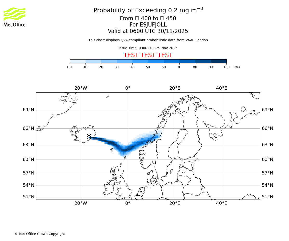 Quantitative Volcanic Ash charts (QVA) are produced in accordance with International Civil Aviation Organization (ICAO) Annex 3 requirements and are provided as well as the London Volcanic Ash Advisory Graphics (VAG) and Advisories (VAA). The lowest QVA threshold (0.2 mg/m³) matches to the areas depicted in the VAA and VAG. Both expected ash concentration and probabilistic forecast information is provided in the chart viewer below for eruptions occurring in the London Volcanic Ash Advisory Centre (VAAC) area of responsibility.