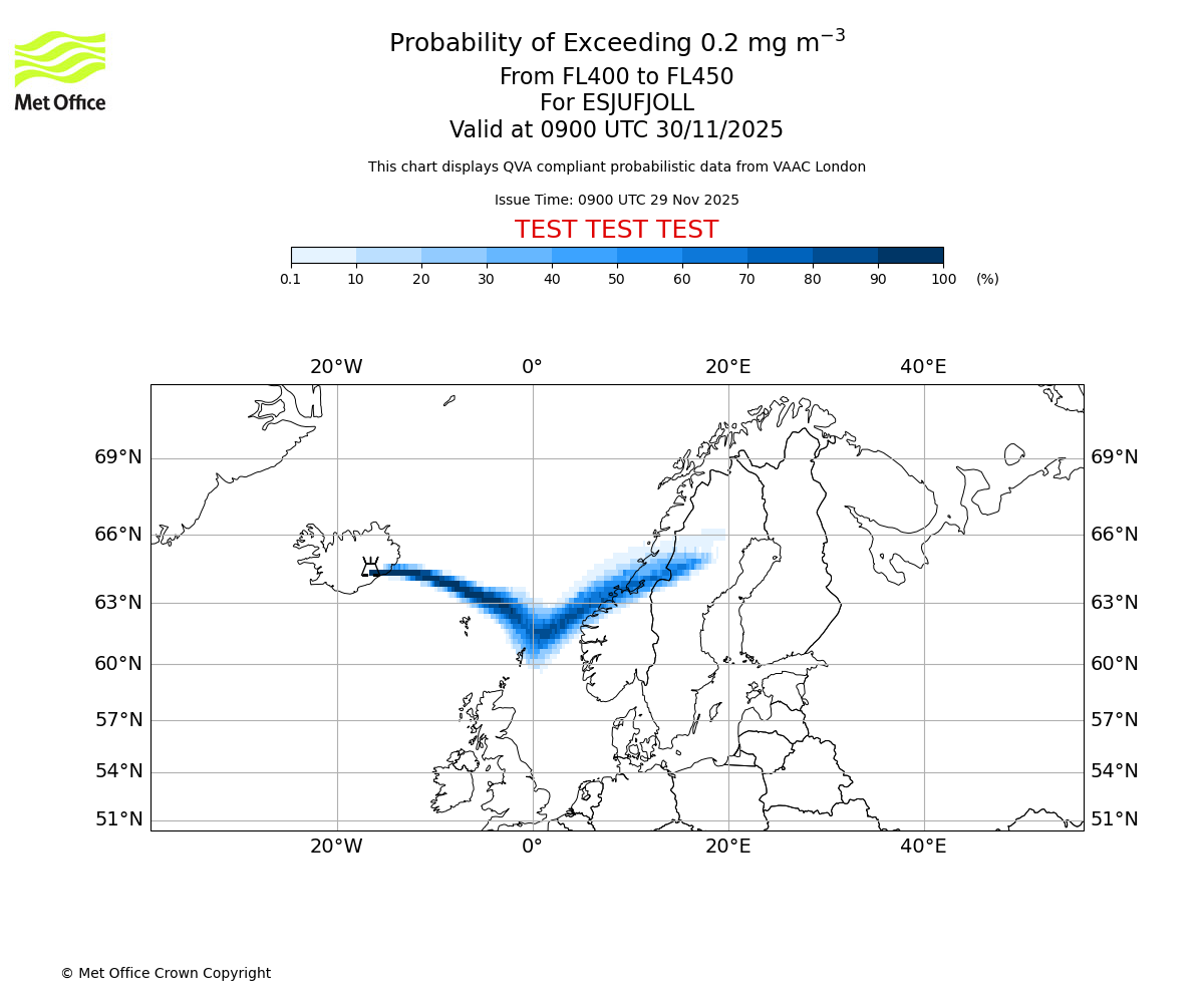 Quantitative Volcanic Ash charts (QVA) are produced in accordance with International Civil Aviation Organization (ICAO) Annex 3 requirements and are provided as well as the London Volcanic Ash Advisory Graphics (VAG) and Advisories (VAA). The lowest QVA threshold (0.2 mg/m³) matches to the areas depicted in the VAA and VAG. Both expected ash concentration and probabilistic forecast information is provided in the chart viewer below for eruptions occurring in the London Volcanic Ash Advisory Centre (VAAC) area of responsibility.