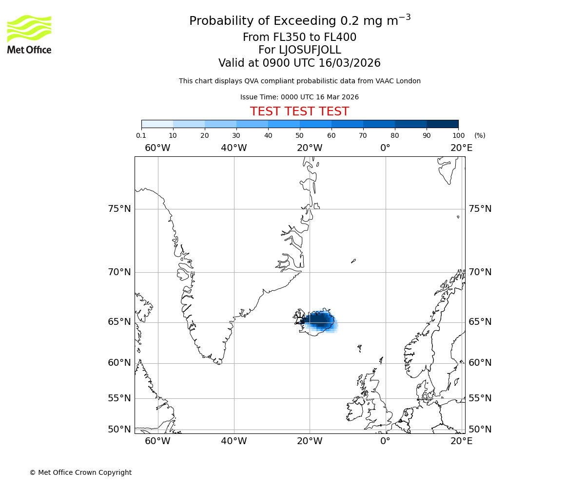 Probability of exceeding 0.2 milligrams per metre cubed. From 350 to 400 for LJOSUFJOLL. Valid at 0600 UTC 16/03/2026