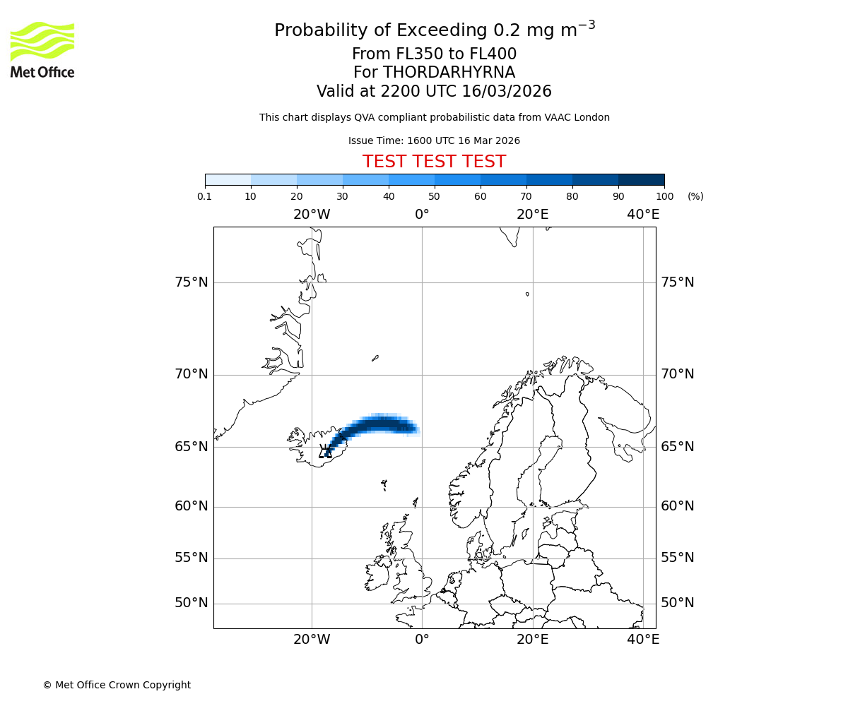 Probability of exceeding 0.2 milligrams per metre cubed. From 350 to 400 for THORDARHYRNA. Valid at 1900 UTC 16/03/2026