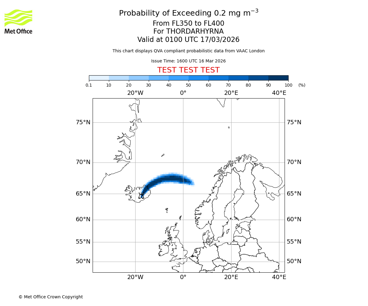 Probability of exceeding 0.2 milligrams per metre cubed. From 350 to 400 for THORDARHYRNA. Valid at 2200 UTC 16/03/2026