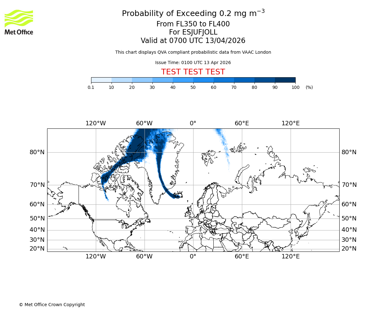 Quantitative Volcanic Ash charts (QVA) are produced in accordance with International Civil Aviation Organization (ICAO) Annex 3 requirements and are provided as well as the London Volcanic Ash Advisory Graphics (VAG) and Advisories (VAA). The lowest QVA threshold (0.2 mg/m³) matches to the areas depicted in the VAA and VAG. Both expected ash concentration and probabilistic forecast information is provided in the chart viewer below for eruptions occurring in the London Volcanic Ash Advisory Centre (VAAC) area of responsibility.