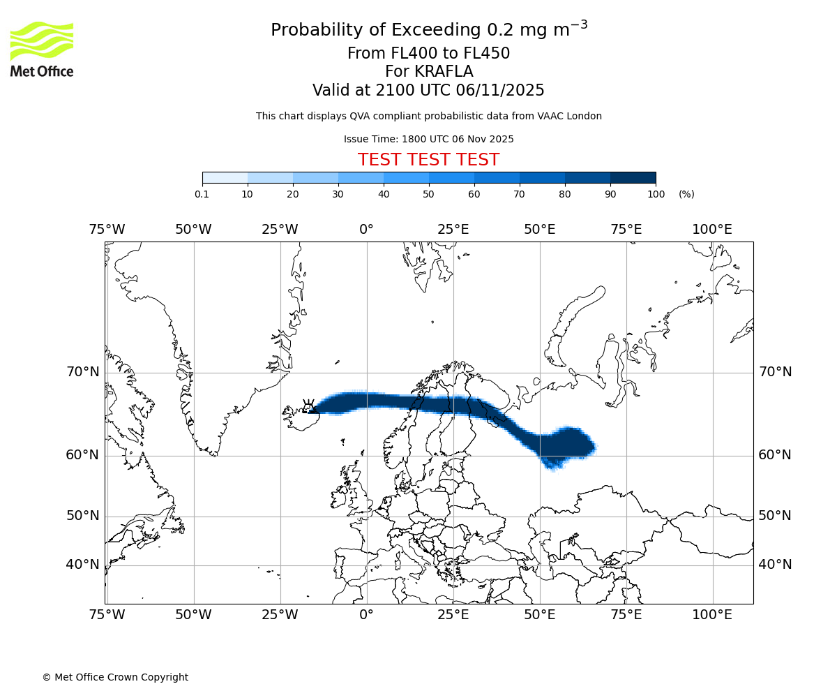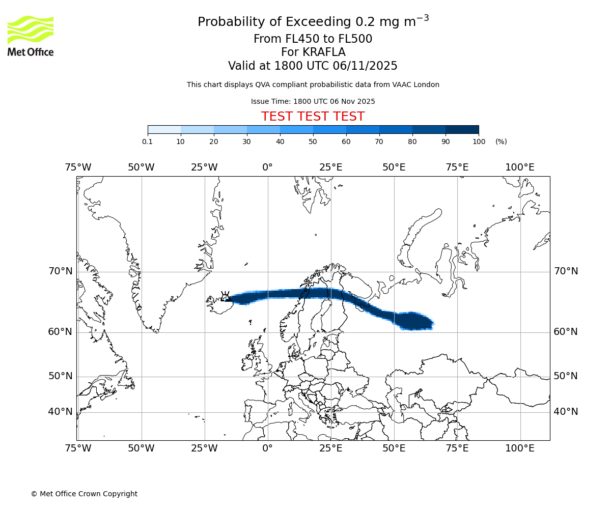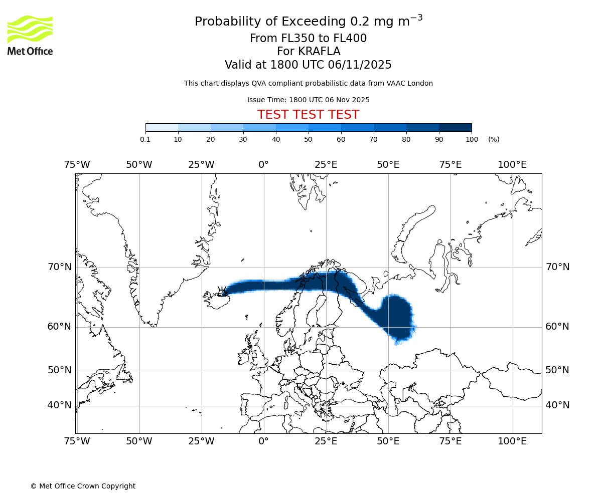 In accordance with ICAO Annex 3, Amendment 82 VAAC London will provide operational QVA forecasts from 27 November 2025 and these will be made available via a VAAC London QVA API information service. These charts are currently provided for test and evaluation purposes (not for operational use) until the introduction of the operational service.