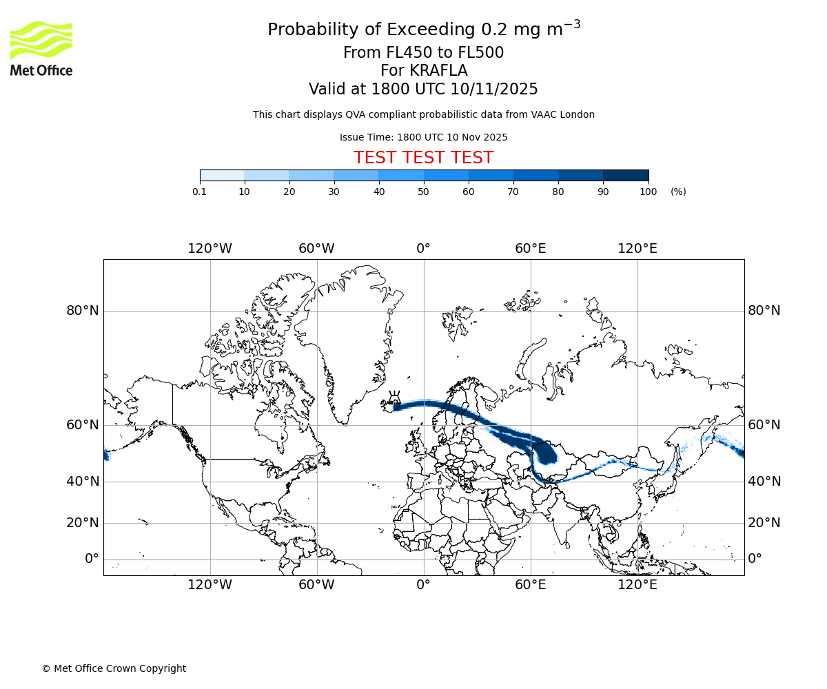In accordance with ICAO Annex 3, Amendment 82 VAAC London will provide operational QVA forecasts from 27 November 2025 and these will be made available via a VAAC London QVA API information service. These charts are currently provided for test and evaluation purposes (not for operational use) until the introduction of the operational service.