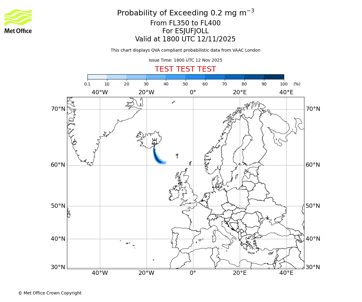 In accordance with ICAO Annex 3, Amendment 82 VAAC London will provide operational QVA forecasts from 27 November 2025 and these will be made available via a VAAC London QVA API information service. These charts are currently provided for test and evaluation purposes (not for operational use) until the introduction of the operational service.