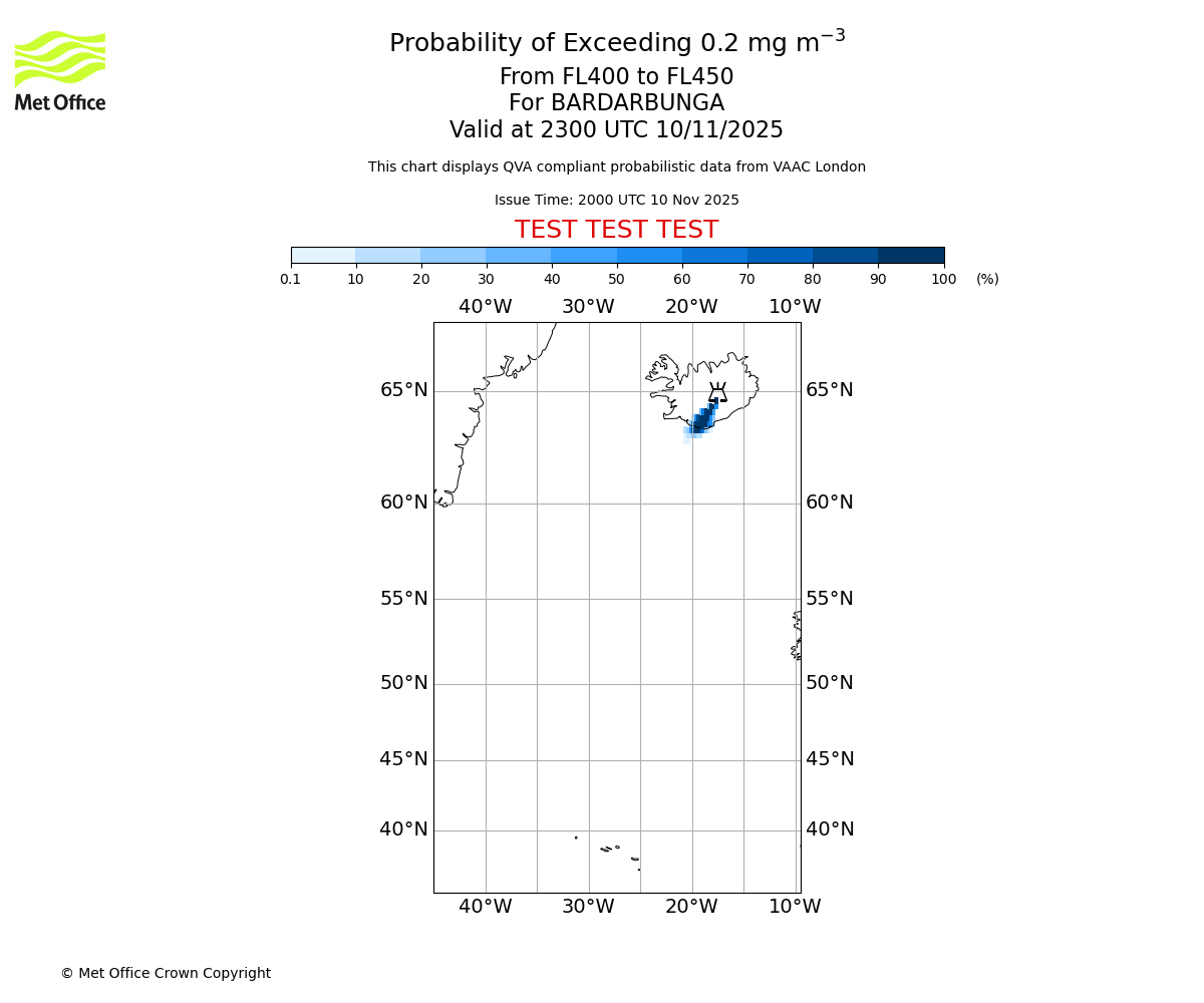 Probability of exceeding 0.2 milligrams per metre cubed. From 400 to 450 for BARDARBUNGA. Valid at 2000 UTC 10/11/2025