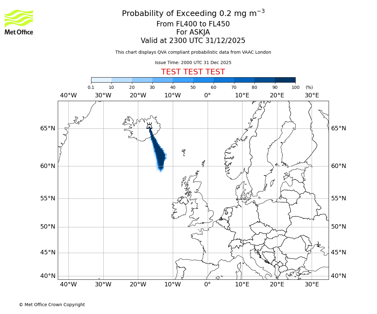 Probability of exceeding 0.2 milligrams per metre cubed. From 400 to 450 for ASKJA. Valid at 2000 UTC 31/12/2025