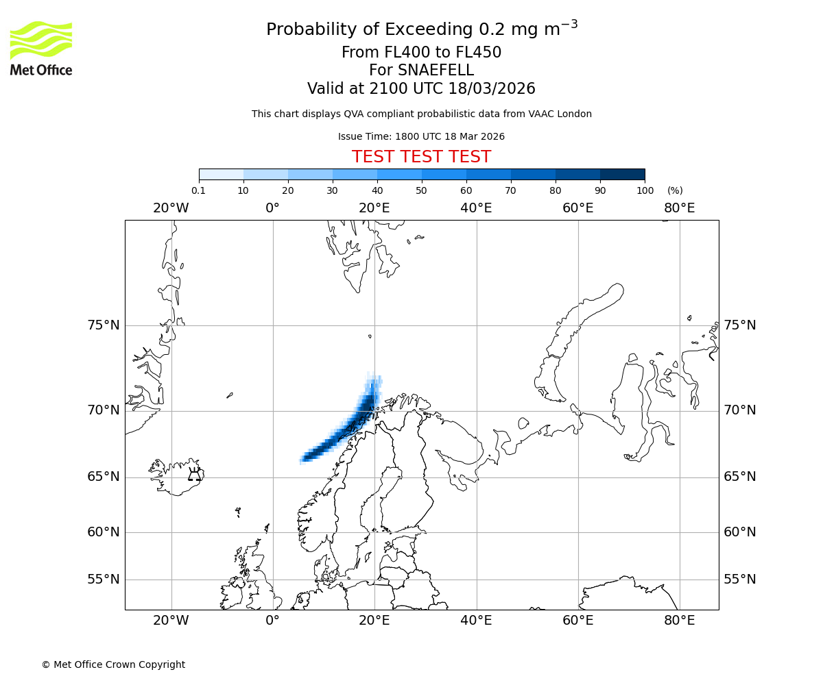 Quantitative Volcanic Ash charts (QVA) are produced in accordance with International Civil Aviation Organization (ICAO) Annex 3 requirements and are provided as well as the London Volcanic Ash Advisory Graphics (VAG) and Advisories (VAA). The lowest QVA threshold (0.2 mg/m³) matches to the areas depicted in the VAA and VAG. Both expected ash concentration and probabilistic forecast information is provided in the chart viewer below for eruptions occurring in the London Volcanic Ash Advisory Centre (VAAC) area of responsibility.