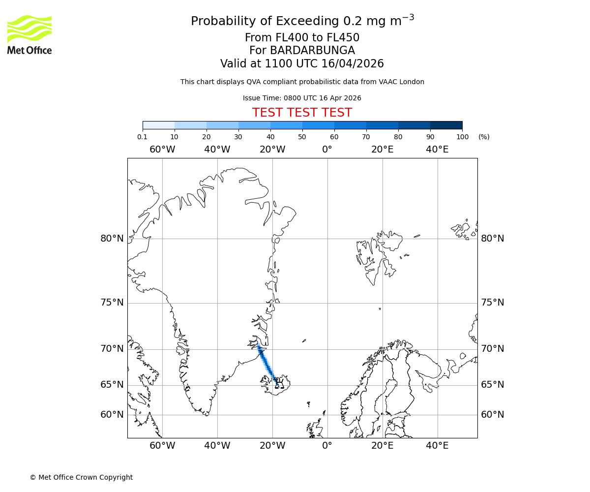 Probability of exceeding 0.2 milligrams per metre cubed. From 400 to 450 for BARDARBUNGA. Valid at 0800 UTC 16/04/2026