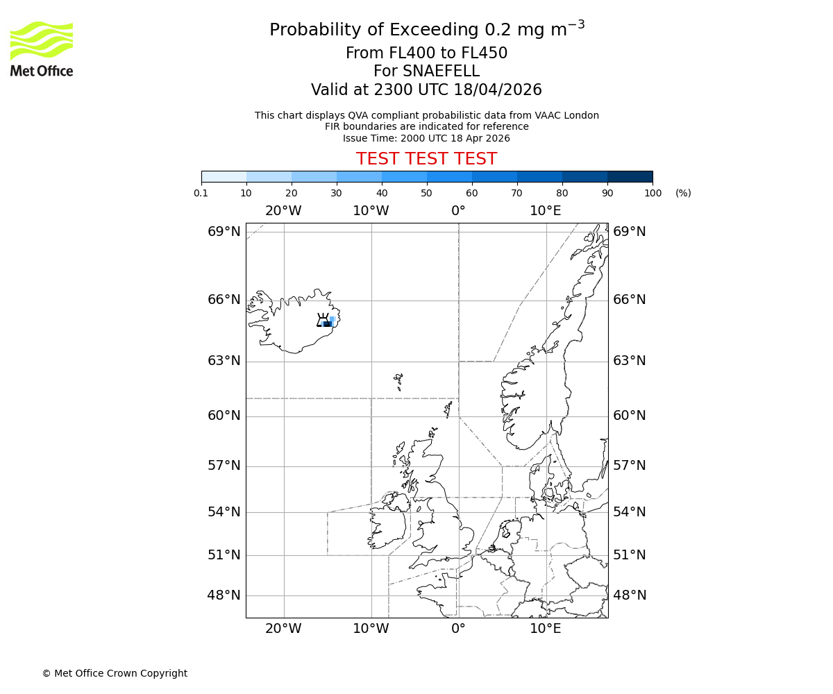 Probability of exceeding 0.2 milligrams per metre cubed. From 400 to 450 for SNAEFELL. Valid at 2000 UTC 18/04/2026